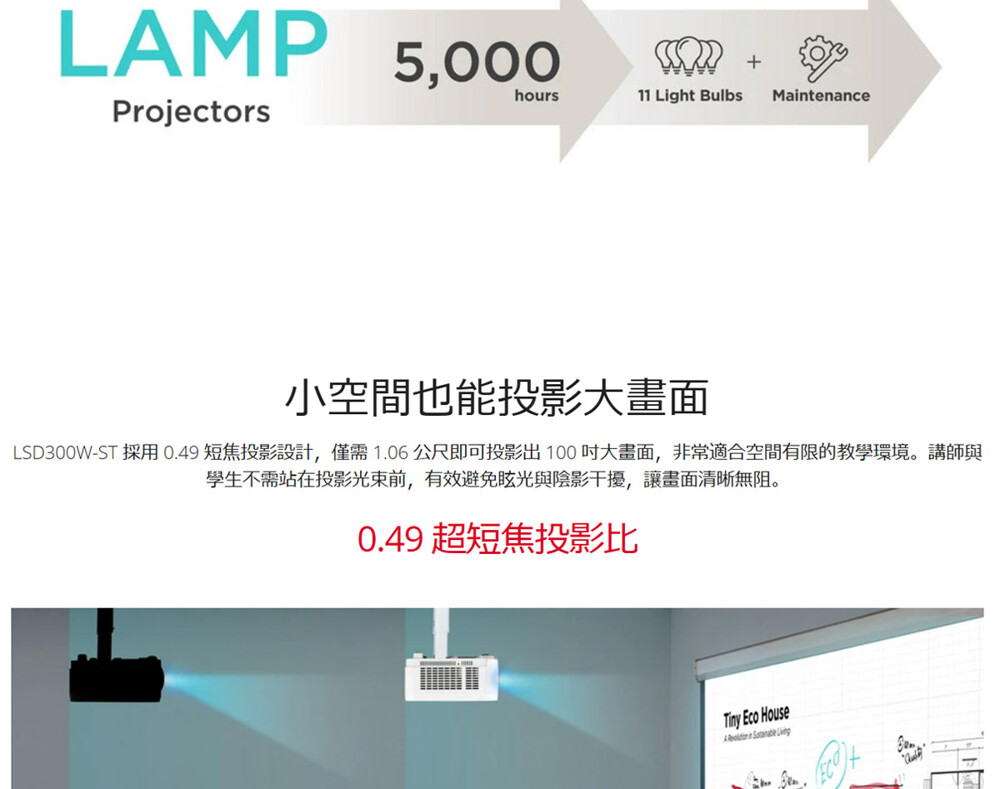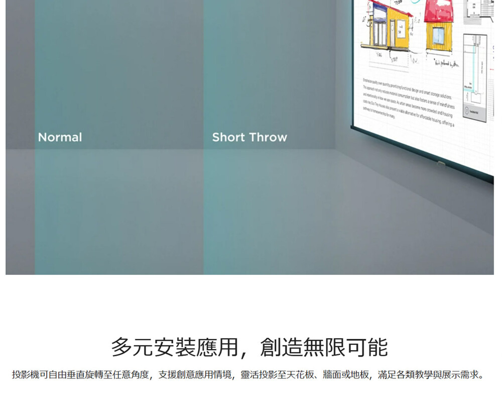 ▲0.49 短焦鏡頭搭配 360° 投影,無眩光畫面,靈活安裝不受空間限制