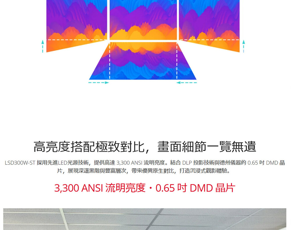 ▲搭載 0.65 吋 DMD 晶片,提供 3,300 ANSI 流明亮度與高原生對比,呈現銳利清晰的影像畫面