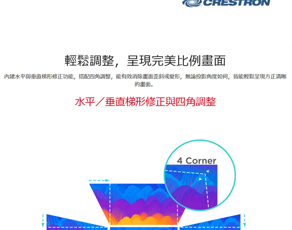 ▲操作簡便,具備一鍵開關機、水平/垂直梯形修正與四角調整功能,快速完成安裝設定