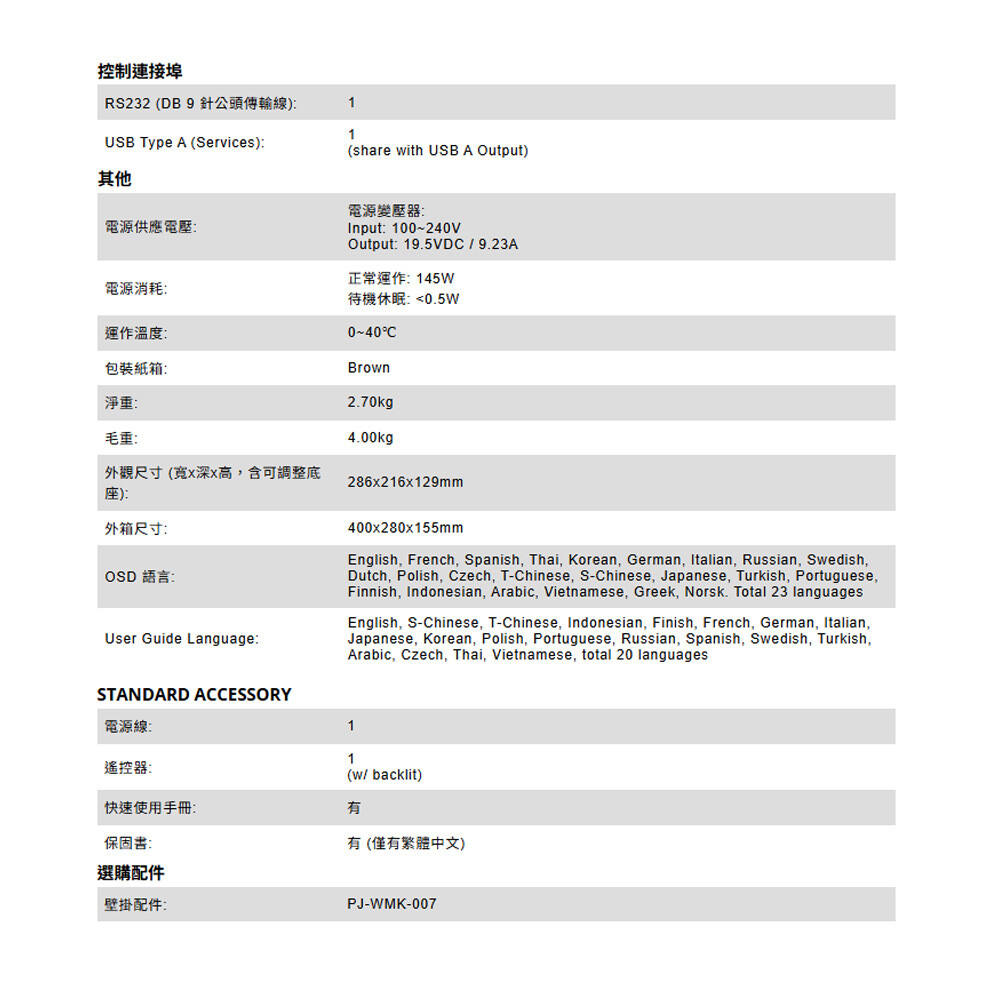 -外觀尺寸 (寬x深x高,含可調整底座): 286x216x129mm