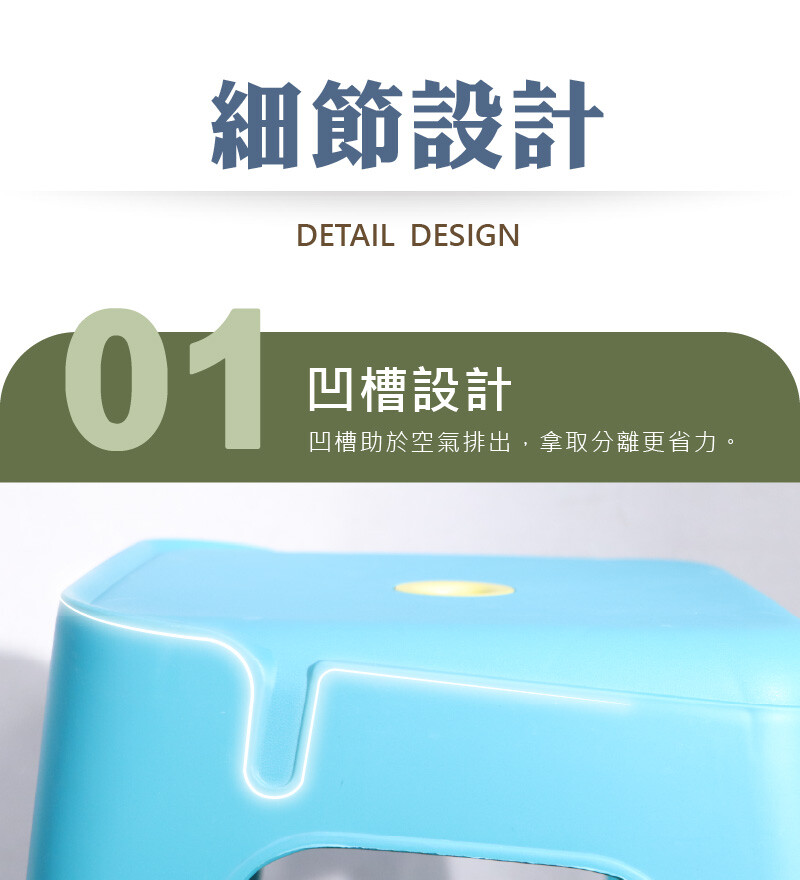 堆疊時凹槽助於空氣排出,拿取分離時更省力。
