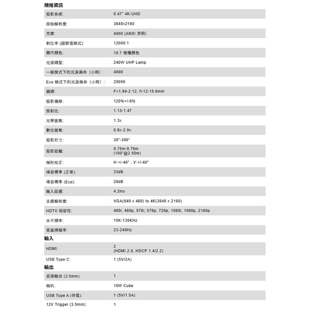 -4,000 ANSI 流明、真 4K HDR 解析度