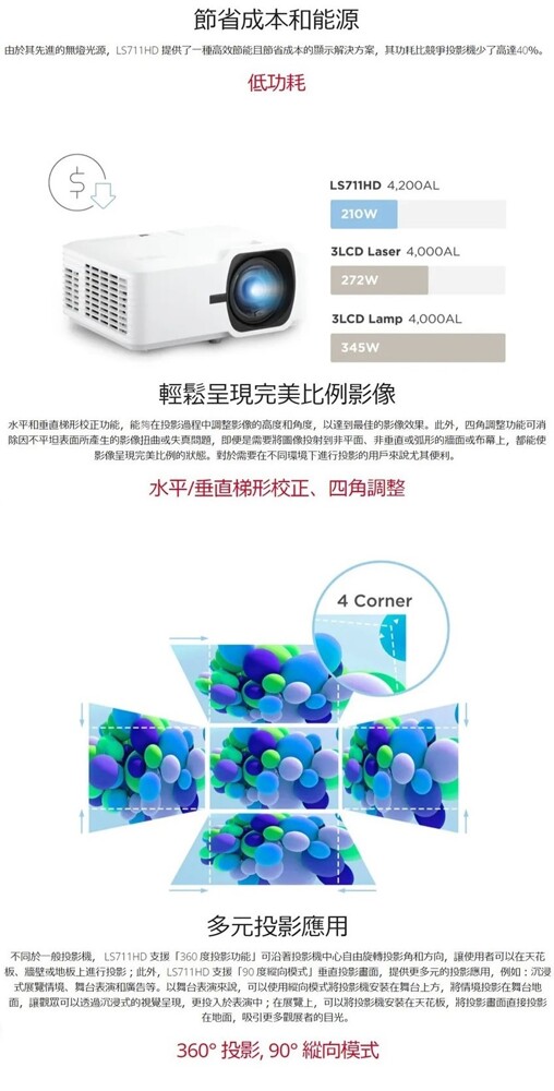 ▲支援 360° 及縱向投影、水平垂直梯形校正,全方位滿足高階商用需求