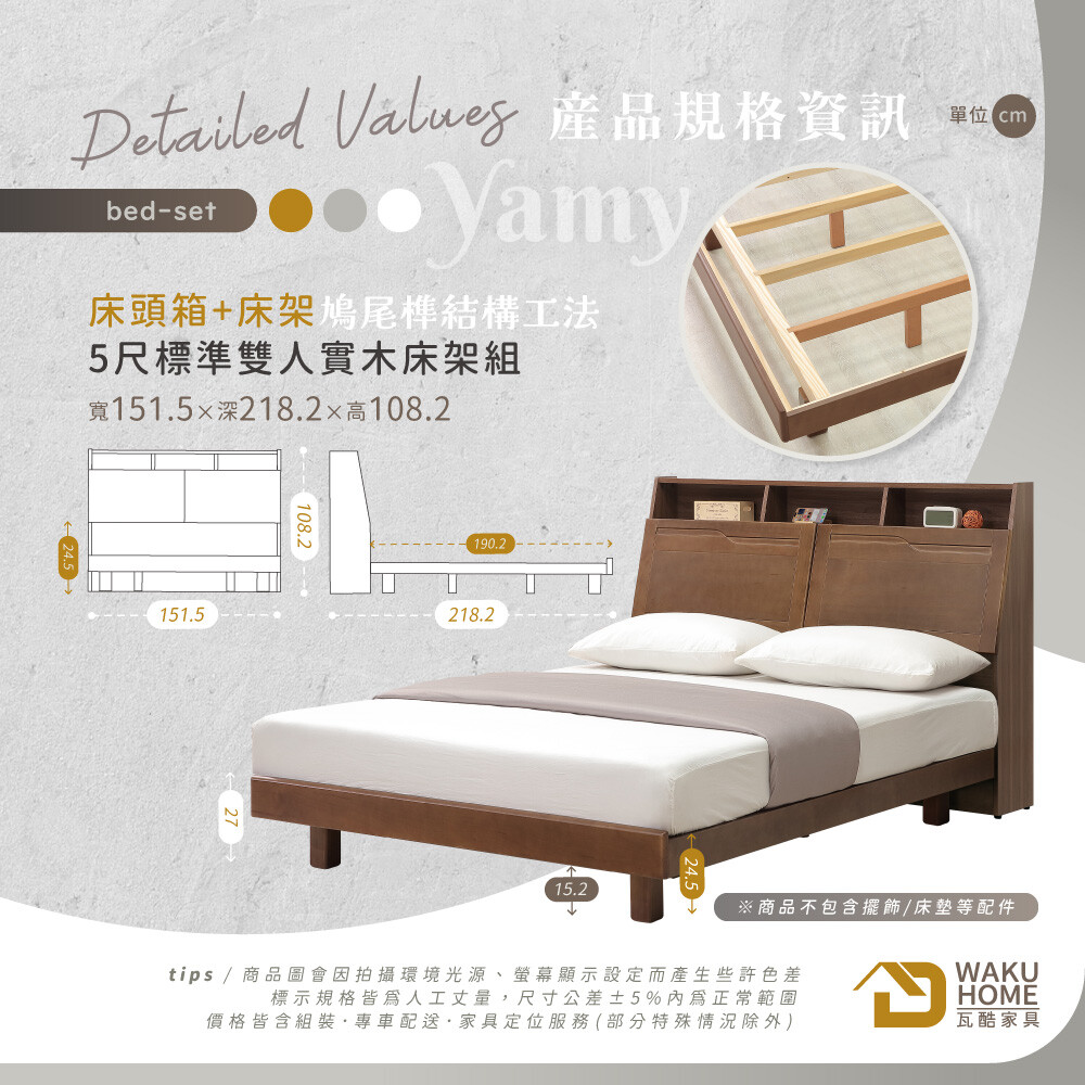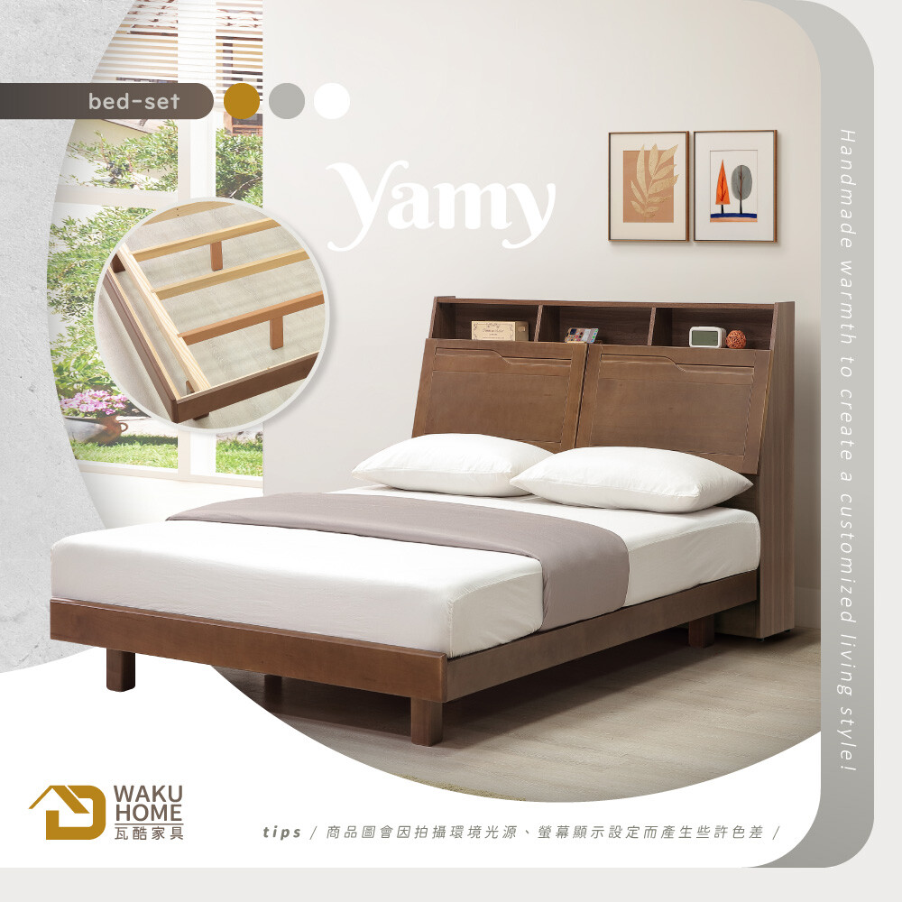 Yamy5尺標準雙人淺胡桃實木床組(床頭箱-床架-附USB插座) 實木面板/檯面/座腳A010-532+532A