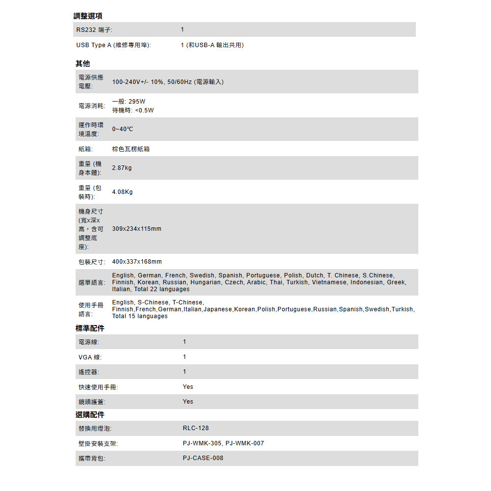 -重量 (機身本體): 2.87kg;重量 (包裝時): 4.08Kg