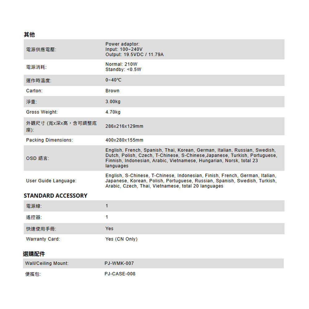 -外觀尺寸 (寬x深x高,含可調整底座): 286x216x129mm