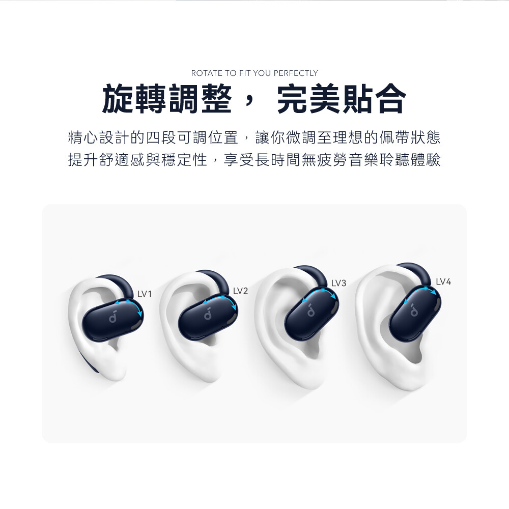 🔹旋轉調整 完美貼合|機身四段可調設計,根據耳型、使用習慣進行微調,享受無疲勞的聆聽體驗