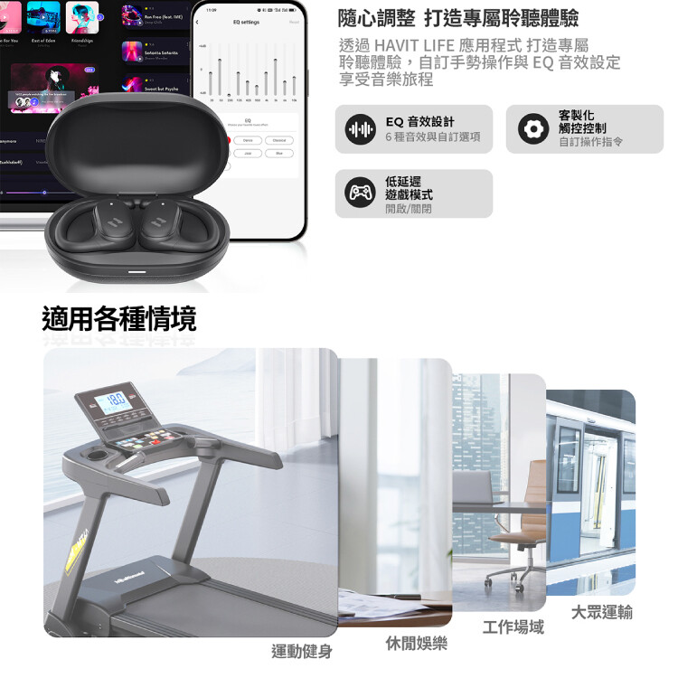 通過專屬APP自定義手勢操作與6種EQ音效,打造專屬你的運動音樂體驗。