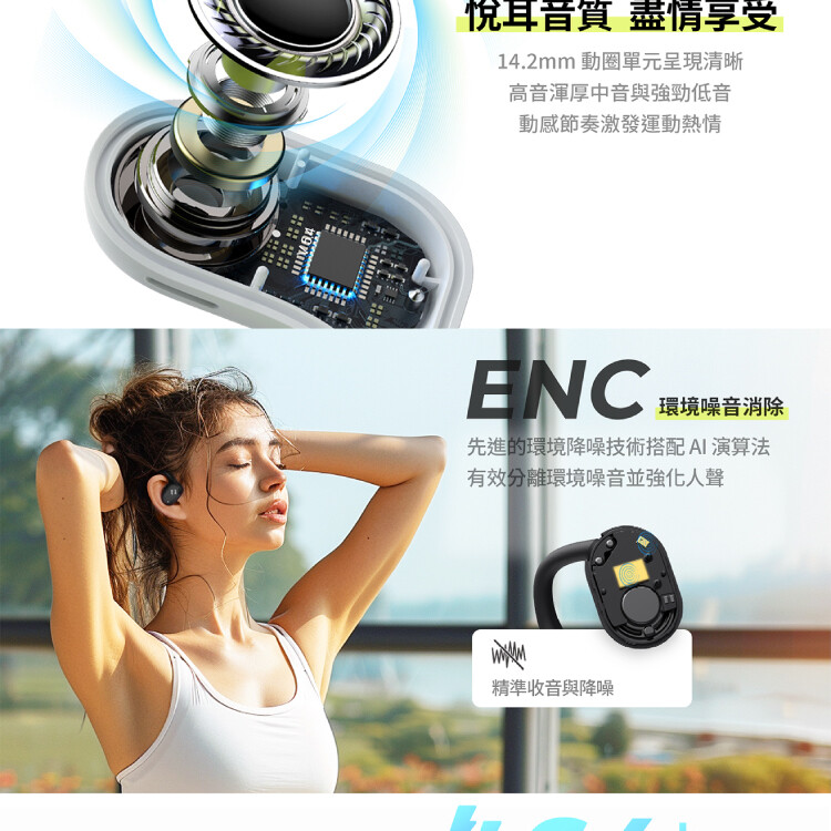 特製大尺寸驅動單元,高音清澈、中音飽滿、低音強勁,讓運動更有節奏感。