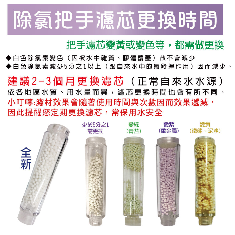 簡易檢測把手濾芯更換時間:白色除氯素變黃或變色(因被水中雜質、膠體覆蓋)故不會減少;白色除氯素減少五分之一以上(跟自來水中的氯發揮作用)因而減少(建議3個月更換濾芯,如與前置過濾器搭配使用,則延長使用壽命,建議6個月更換濾芯)