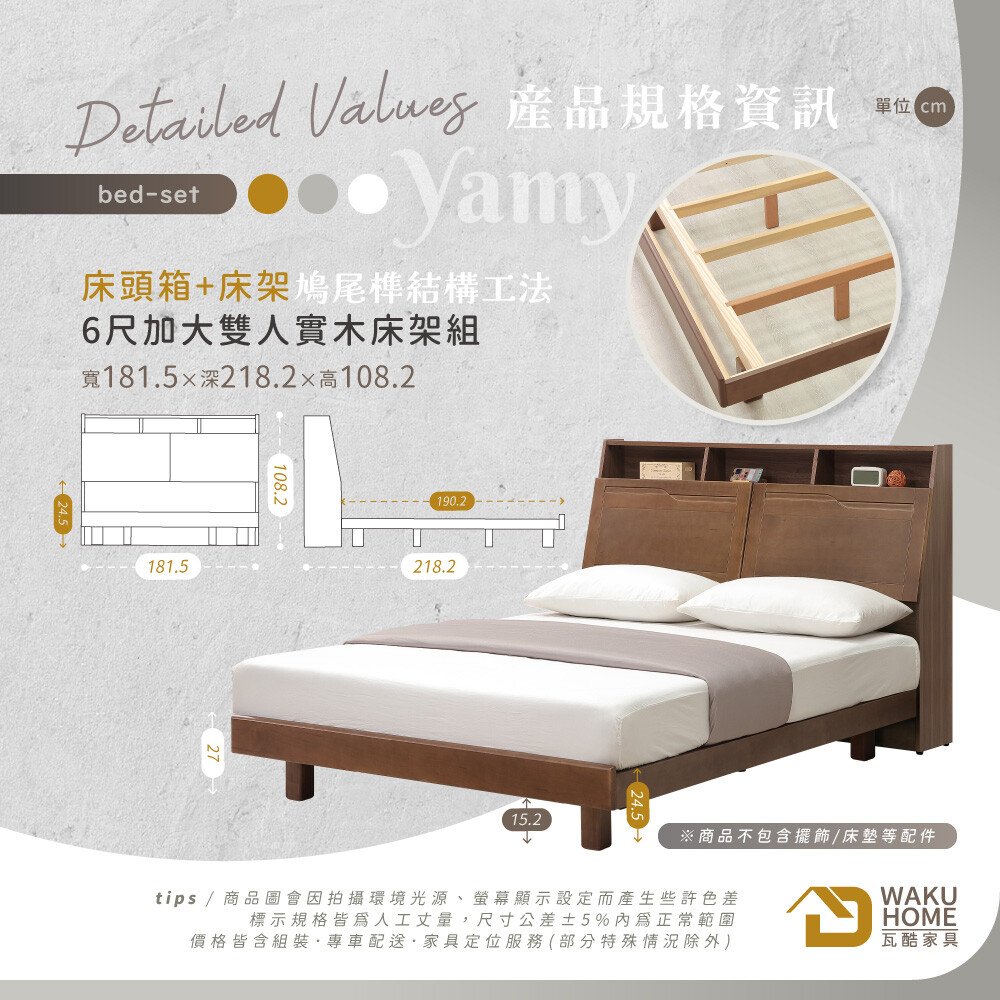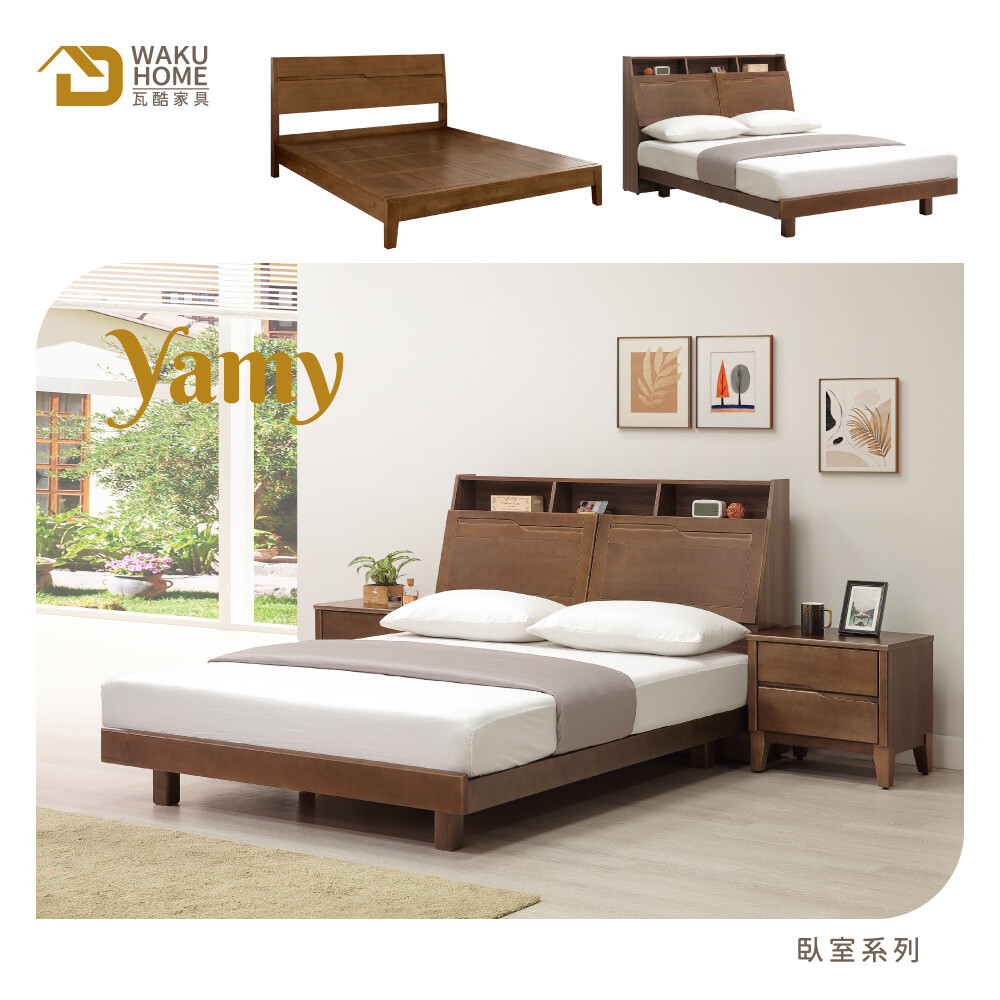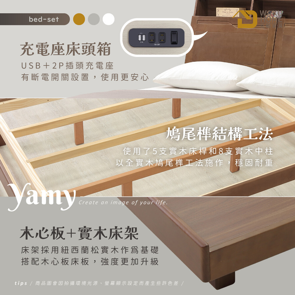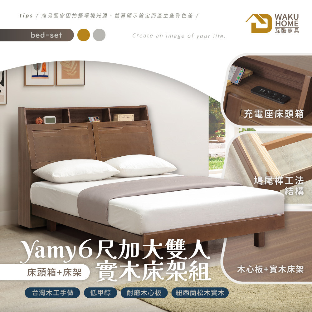 Yamy6尺加大雙人淺胡桃實木床組(床頭箱-床架-附USB插座) 實木面板/檯面/座腳A010-533+533A