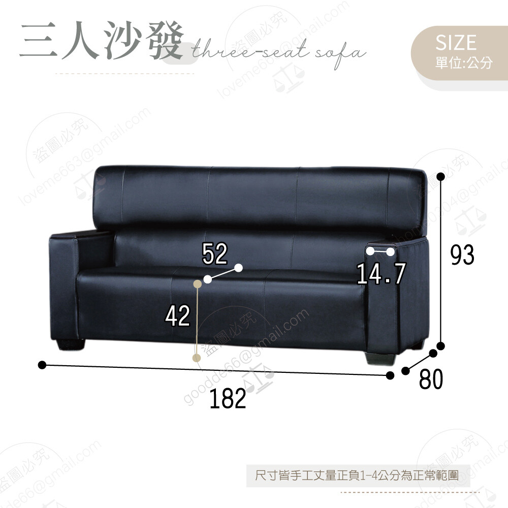 三人沙發:寬182×深80×高93公分