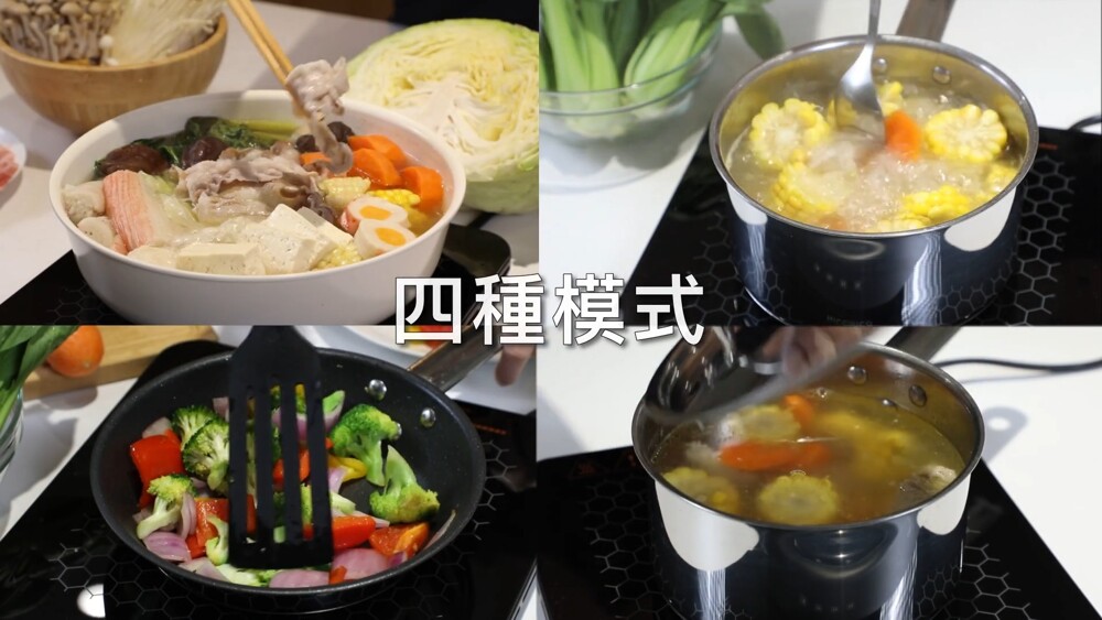 🫕4種烹煮功能,火鍋(煮蒸燒燙)、快炒(炒煎烤炸)、煲湯(燉煲)、保溫(小火慢煮)。