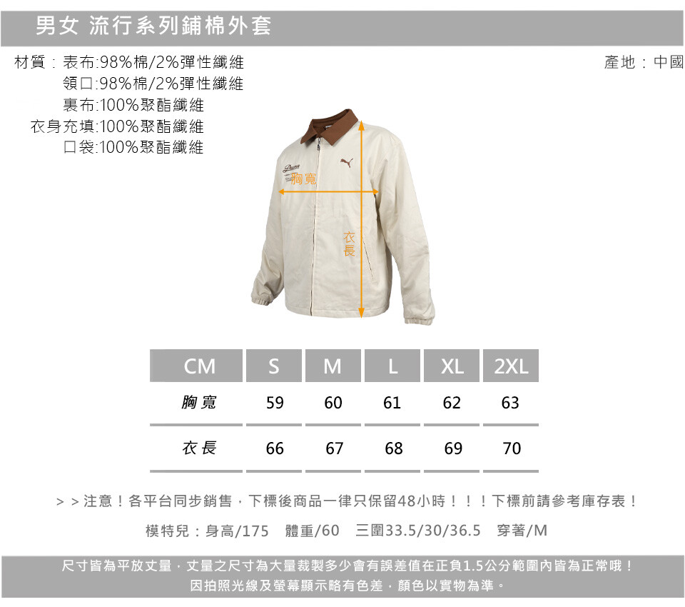 PUMA 男女流行系列鋪棉外套-運動 上衣 休閒 慢跑 米白咖啡