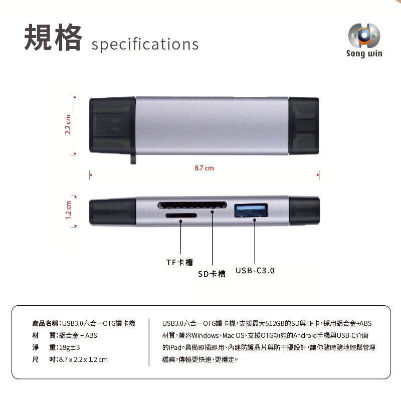 USB3.0 六合一 OTG讀卡,支援最大512GB的SD與TF卡,