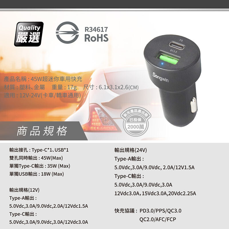 Songwin 急速45W 超迷你快充PD+QC車載充電器/車充(附贈Type-C充電線)