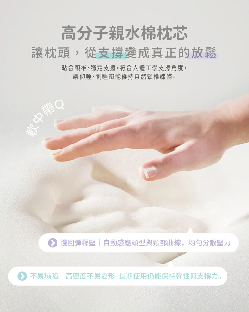 圓潤弧形設計 更舒服的包覆感 高密度聚氨酯記憶棉 慢回彈釋壓核心 冰絲涼感 除濕速乾表布 - 布套 85%尼龍+15%彈性纖維 枕芯 100%聚氨酯 尺寸 70x40cm 高度 10~15cm 產地 中國