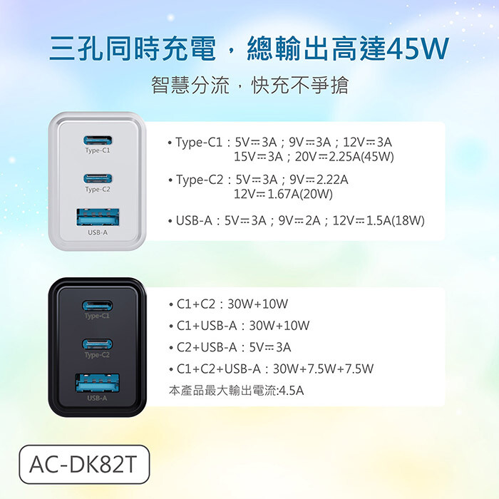 Type-C1:5V=3A; 9V=3A; 12V=3A; 15V=3A; 20V=2.25A(45W)