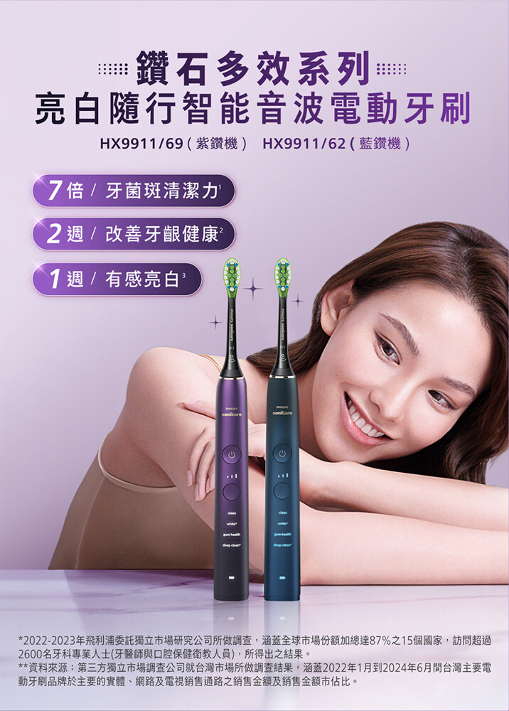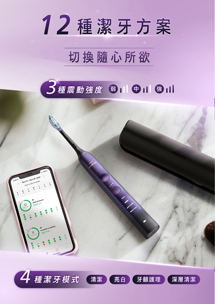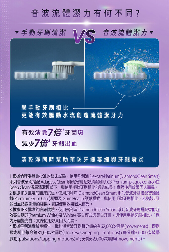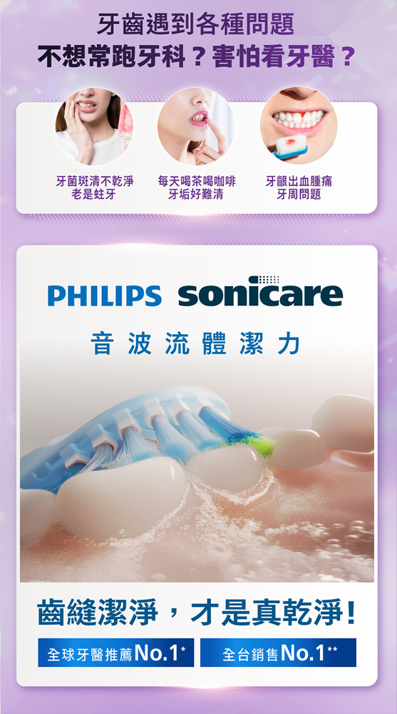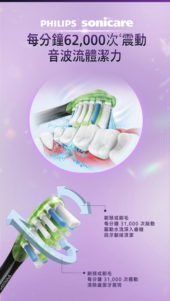 Sonicare音波流體潔力,每分鐘62,000次震動,徹底清潔牙菌斑
