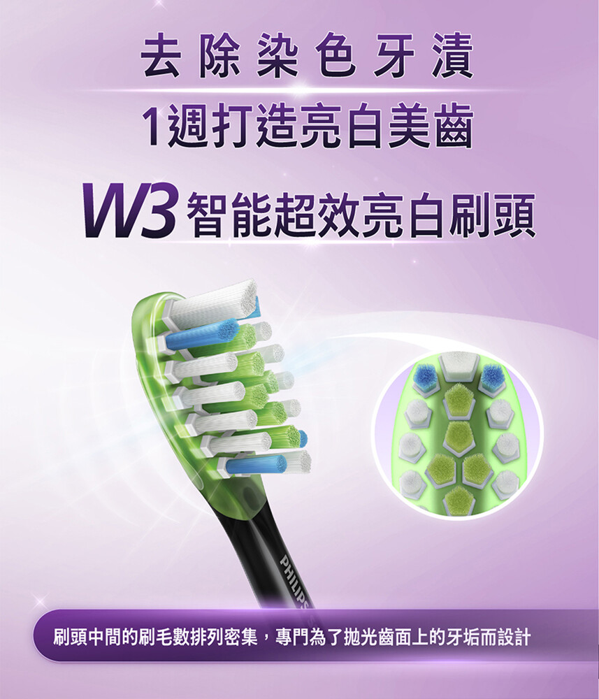全新升級的智能超效亮白W3刷頭,具彈性矽膠包覆刷頭,幫助減緩牙刷震動的力道,