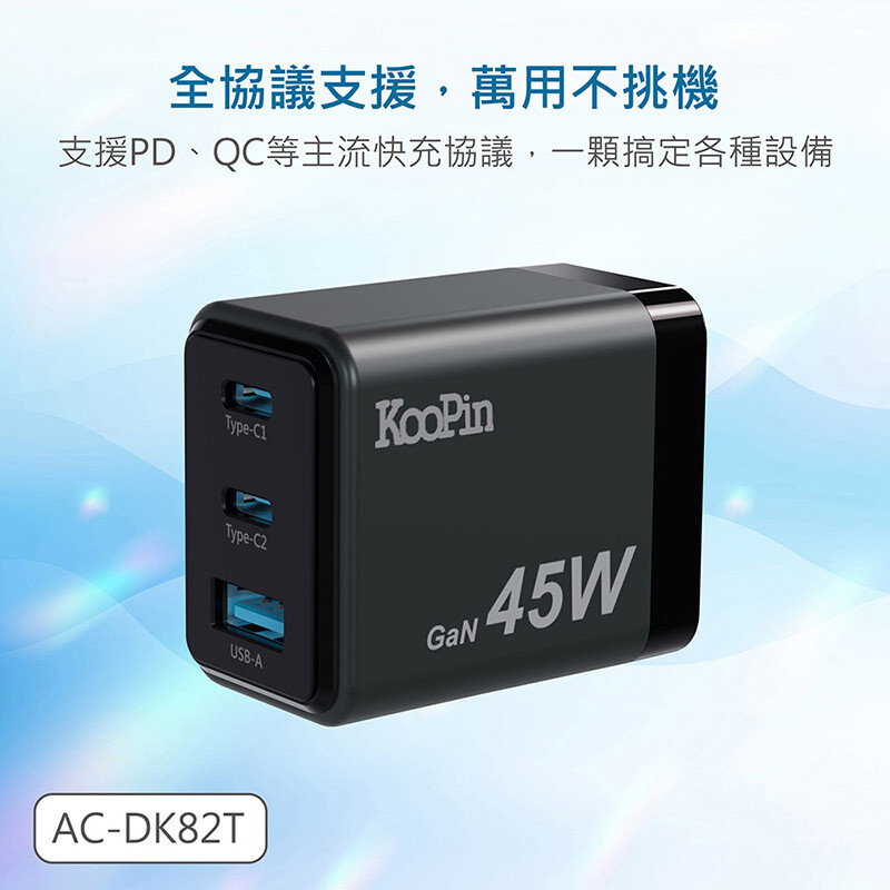 KooPin 台灣製造45W氮化鎵 雙USB-C+USB-A手機急速快充充電器(附贈Type-C充電線)