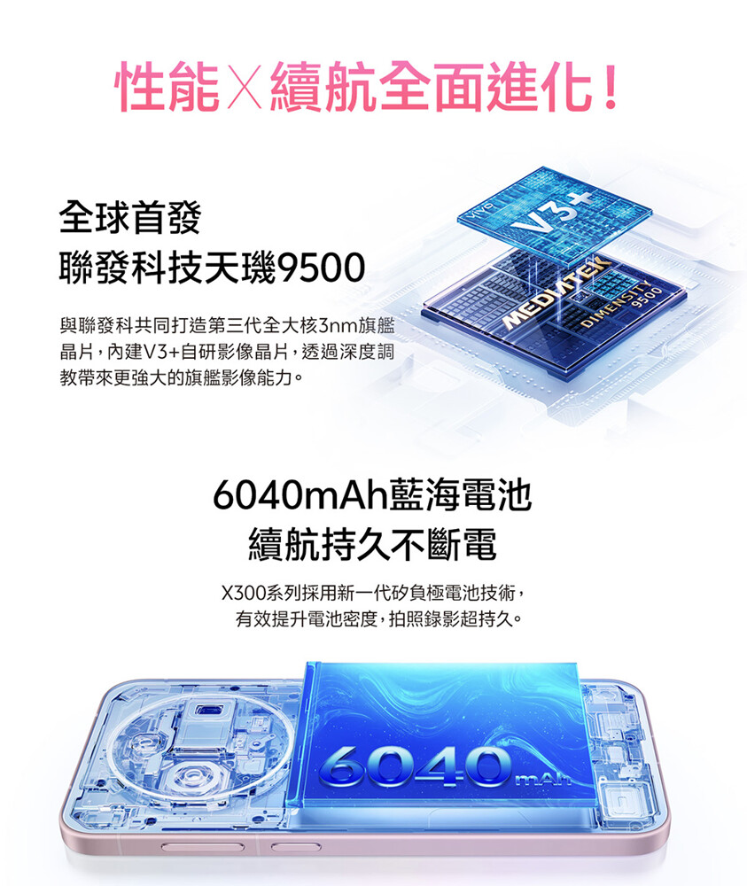 vivo X300 搭載聯發科 2025 年度旗艦晶片天璣 9500,採用台積電第三代 3 奈米製程,使超大核在相同性能下功耗降低 55%,其中單核性能較上一代提升約 32%、多核性能提升約 17%。搭配 vivo 自研的藍圖影像晶片 V3+,更能實現雙晶片深度協同運算,提供強大的影像處理效能與能源效率。
