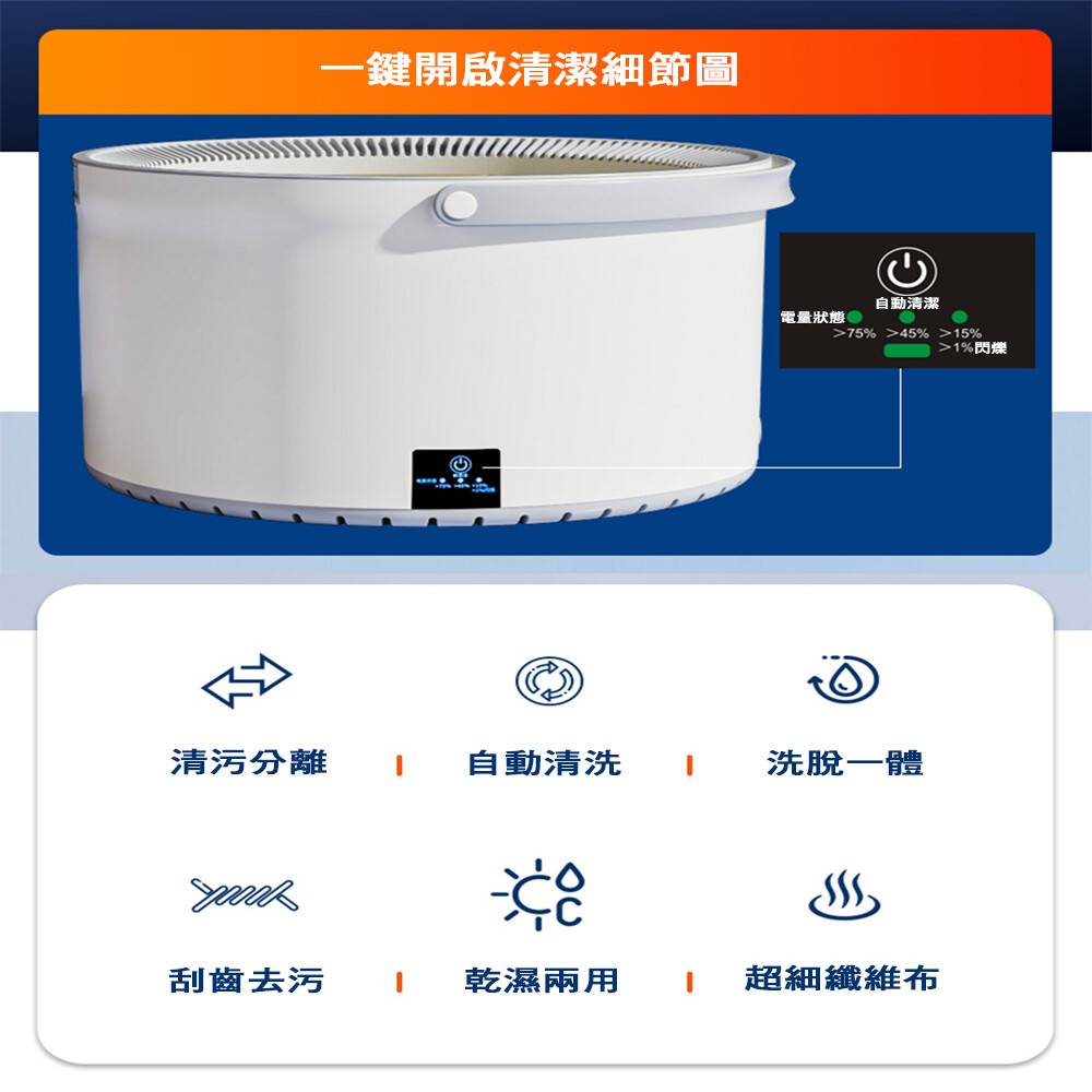 清污分離、自動清洗、洗脫一體、刮齒去污、乾濕兩用、超細纖維布