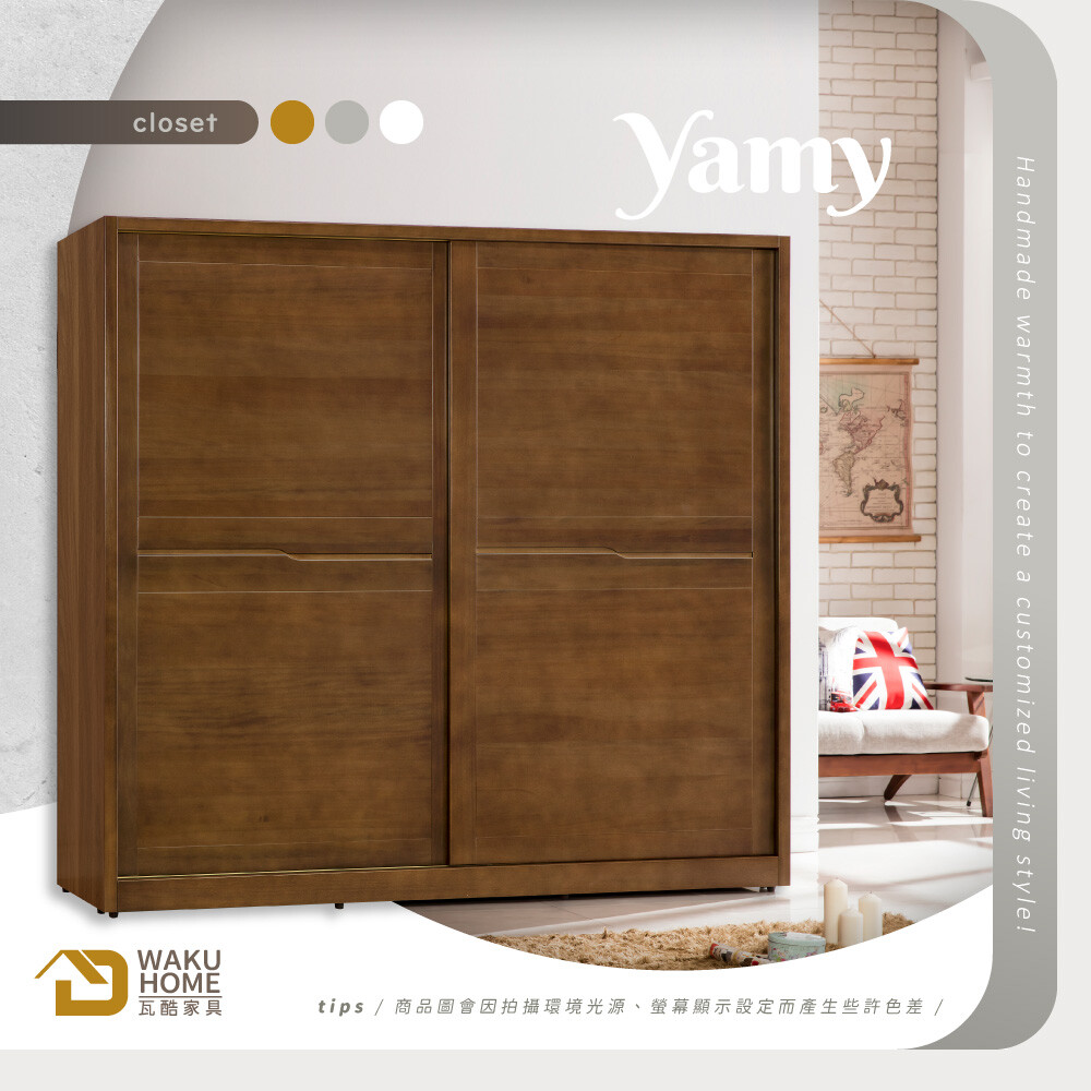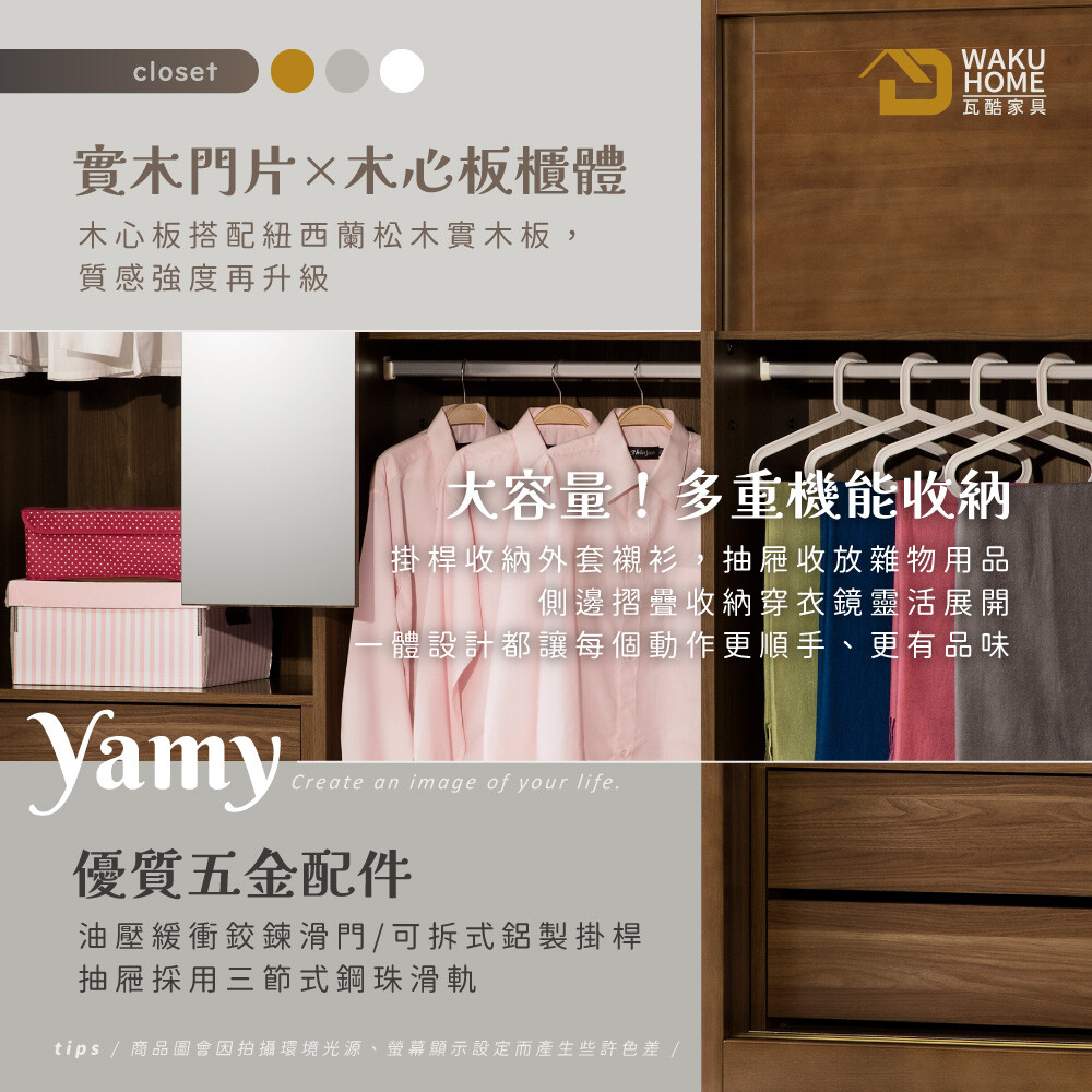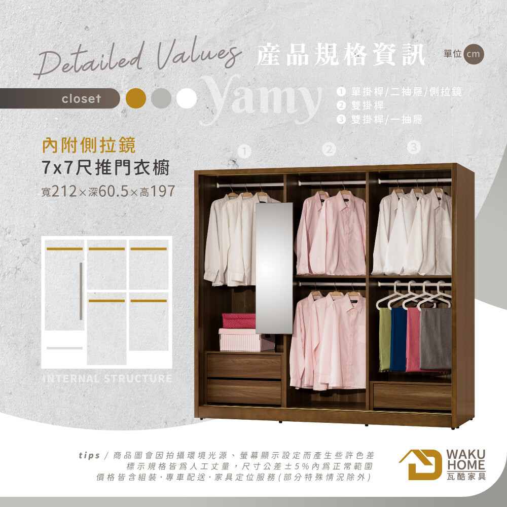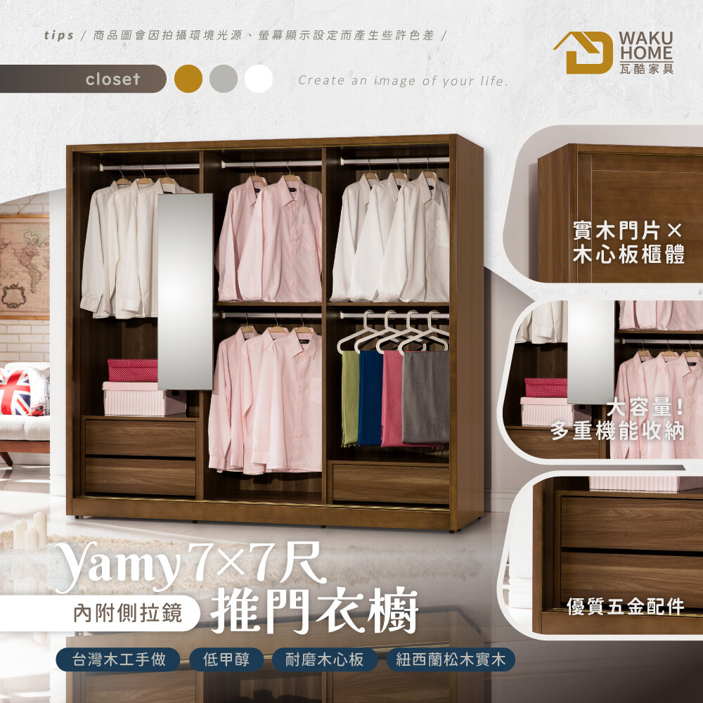 Yamy淺胡桃實木7x7尺推門衣櫥(內附側拉鏡) 滑門衣櫃/實木面板/檯面/座腳A010-535