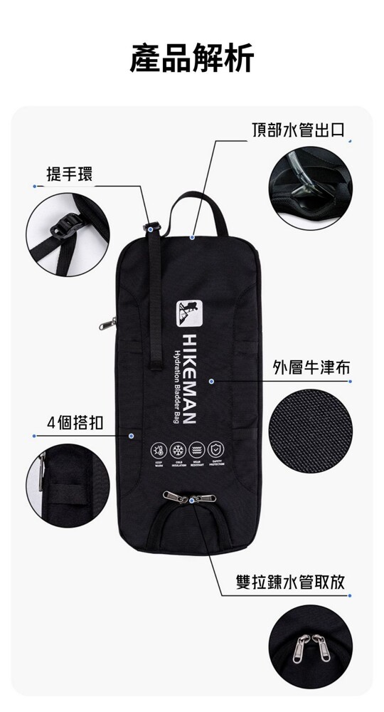 600D牛津布外層堅固耐用,全面保護水袋不受戶外磨損或穿刺