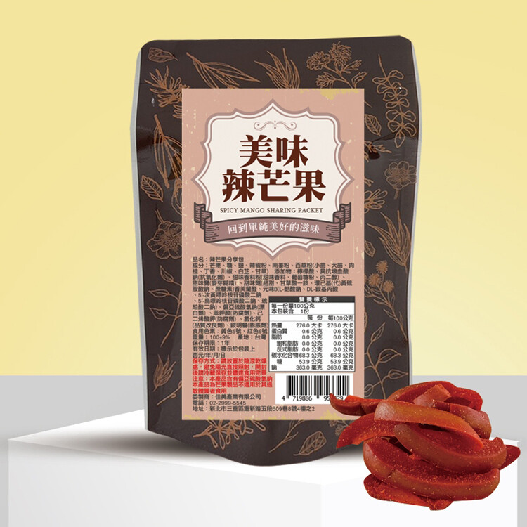 成份:原料:芒果、糖、鹽、辣椒粉、南姜粉、百草粉(小茴、大茴、肉桂、丁香、川椒、白芷、甘草) 、檸檬酸、異抗壞血酸鈉(抗氧化劑) 、甜味香料粉(甜味香料、葡萄糖粉、丙二醇) 、甜味寶(麥芽糊精) 、甜味劑(紐甜、甘草酸一銨、環已基(代)黃硫胺酸鈉、蔗糖素)香莢蘭醛、元味B(L-麩酸鈉、DL-銨基丙酸、5’-次黃嘌呤核苷磷酸二鈉、5’-鳥嘌呤核苷磷酸二鈉、琥珀酸二鈉)、偏亞硫酸氫鈉(漂白劑) 、苯鉀酸(防腐劑)、己二烯酸鉀(防腐劑) 、氯化鈣(品質改良劑)、銨明礬(膨脹劑) 、食用色素:黃色5號、紅色6號