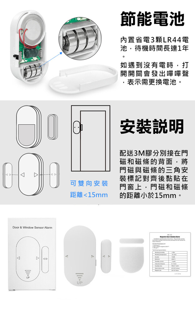 (警報/解除)響30秒/重開機:當門磁與磁條分開 警報響30秒結束 請閉合配對