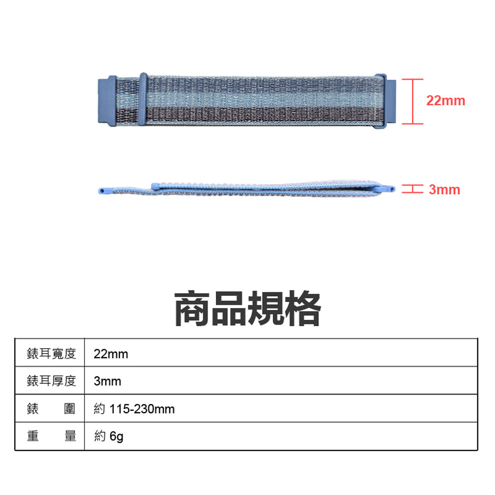 ※收到貨時請開箱錄影保障自身權益 ※鑑賞期內商品不良更換新品(非人為因素),不包含運費。 ★ 錶耳寬度22mm ★ 尼龍編織材質,親膚柔軟 ★ 舒適錶帶,貼合手腕 ★ 透氣性佳,配戴舒適 ★ 魔鬼氈設計,一秒穿戴 ★ 錶帶錶圍約115~230mm