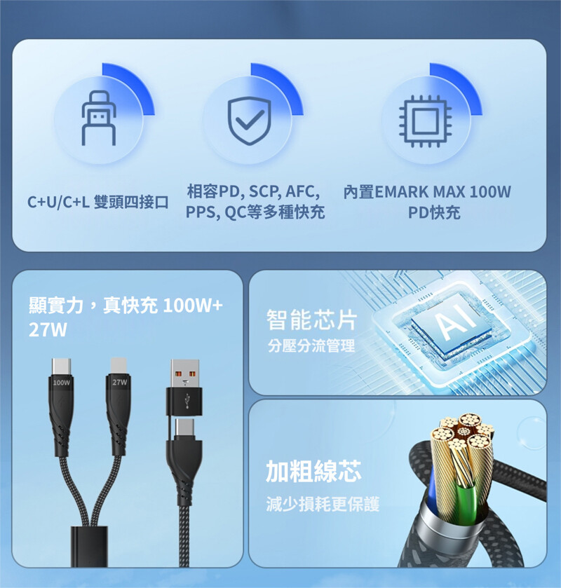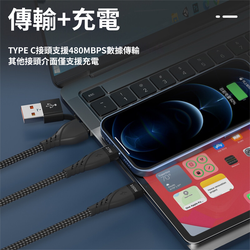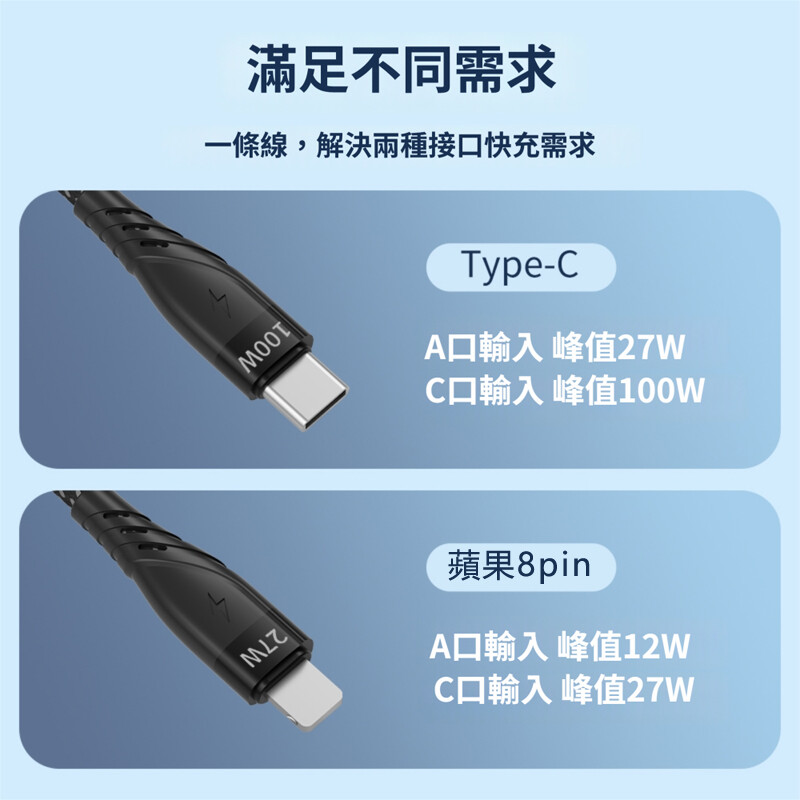 ◆輸入端Type-C可達100W快充標準,輸出端Lightning8pin可達27W、Type-C可達100W