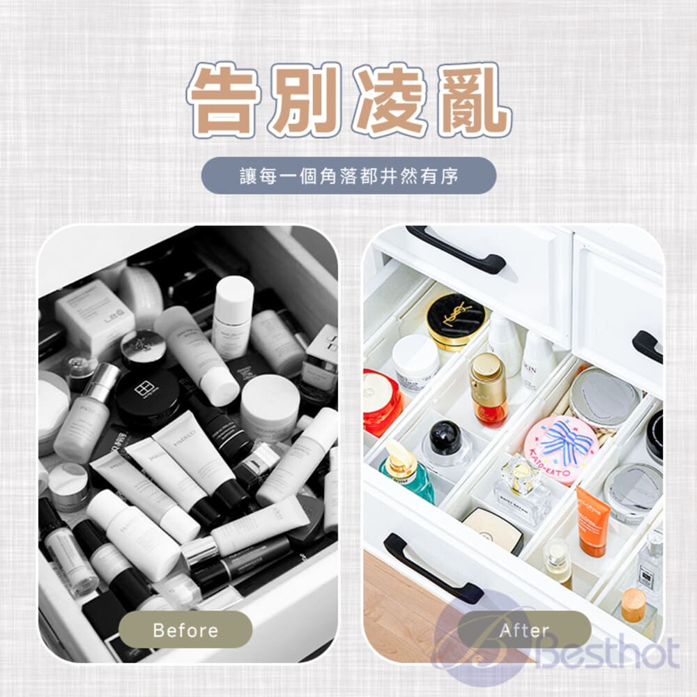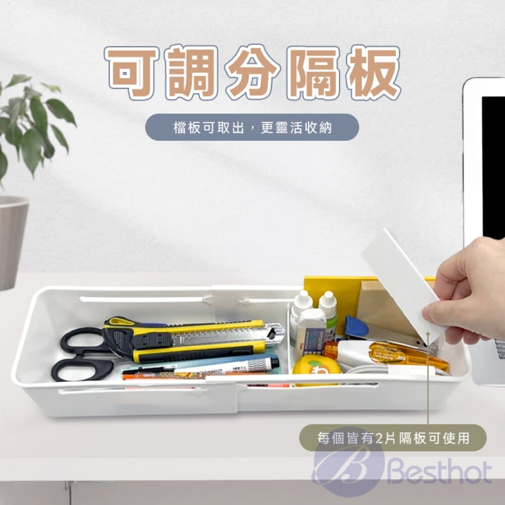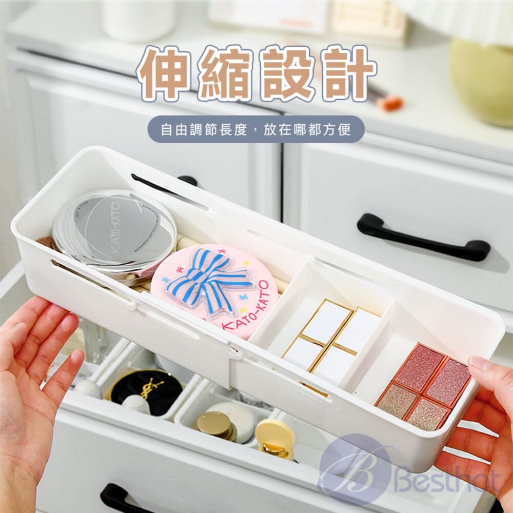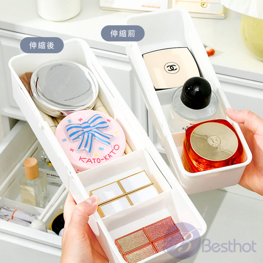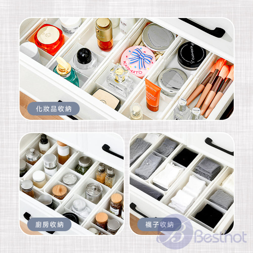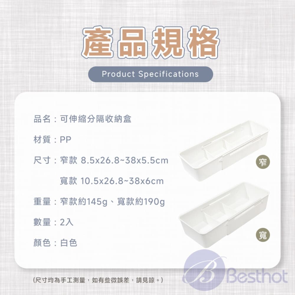 品名 : 可伸縮分隔收納盒 材質 : PP 尺寸 : 窄款 8.5x26.8~38x5.5cm 寬款 10.5x26.8~38x6cm 重量 : 窄款約145g、寬款約190g 數量 : 2入 顏色 : 白色 1.寬+寬 2.窄+窄 3.寬+窄