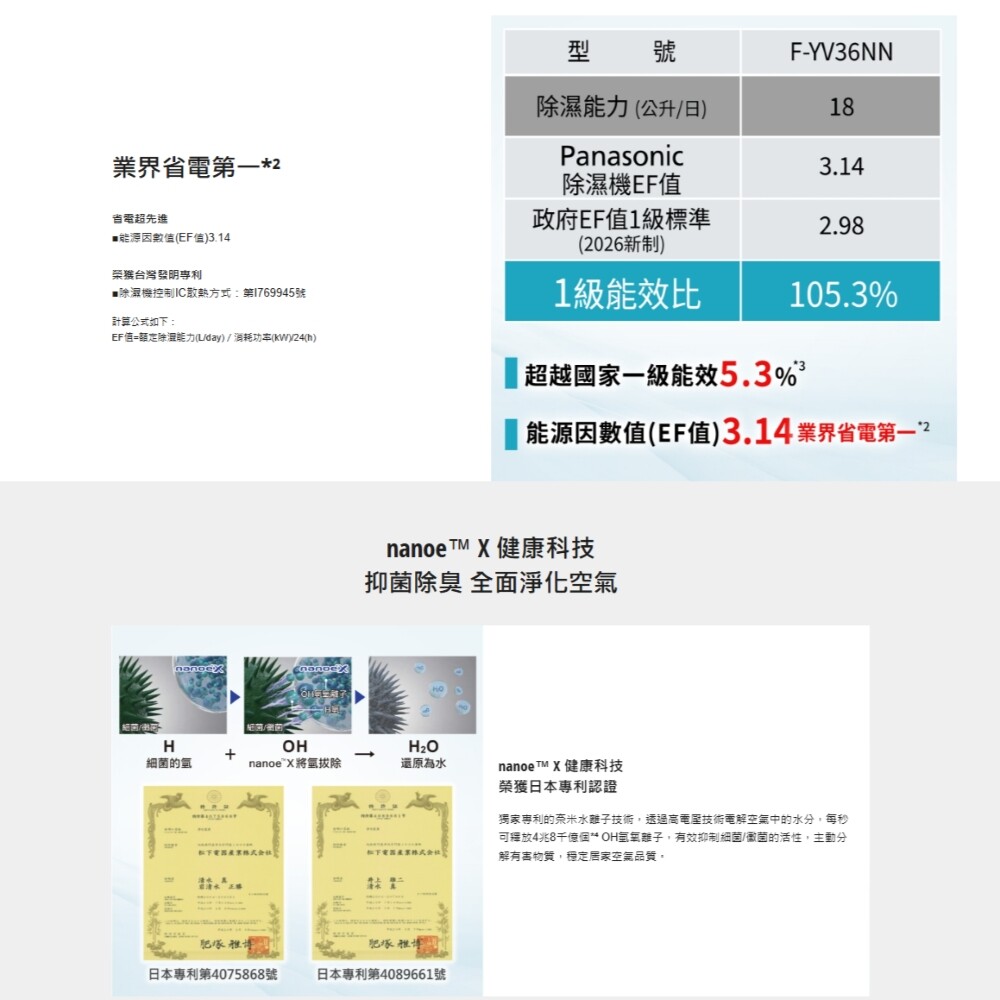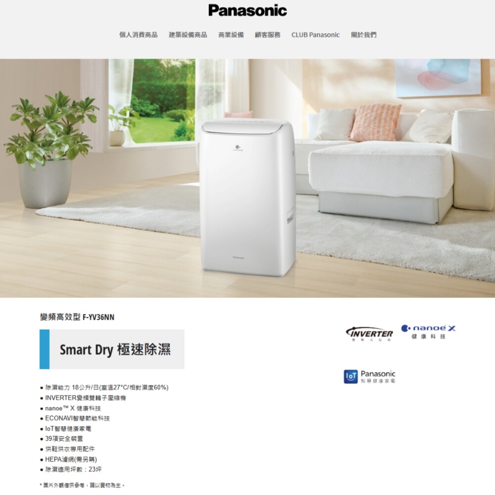 #公司貨 #國際牌 #Panasonic #F-YV36NN #18公升 #變頻智慧節能除濕機 #ECONAVI #奈米銀抗菌濾網 #萬向輪 #39項安全裝置 #APP遠端控制