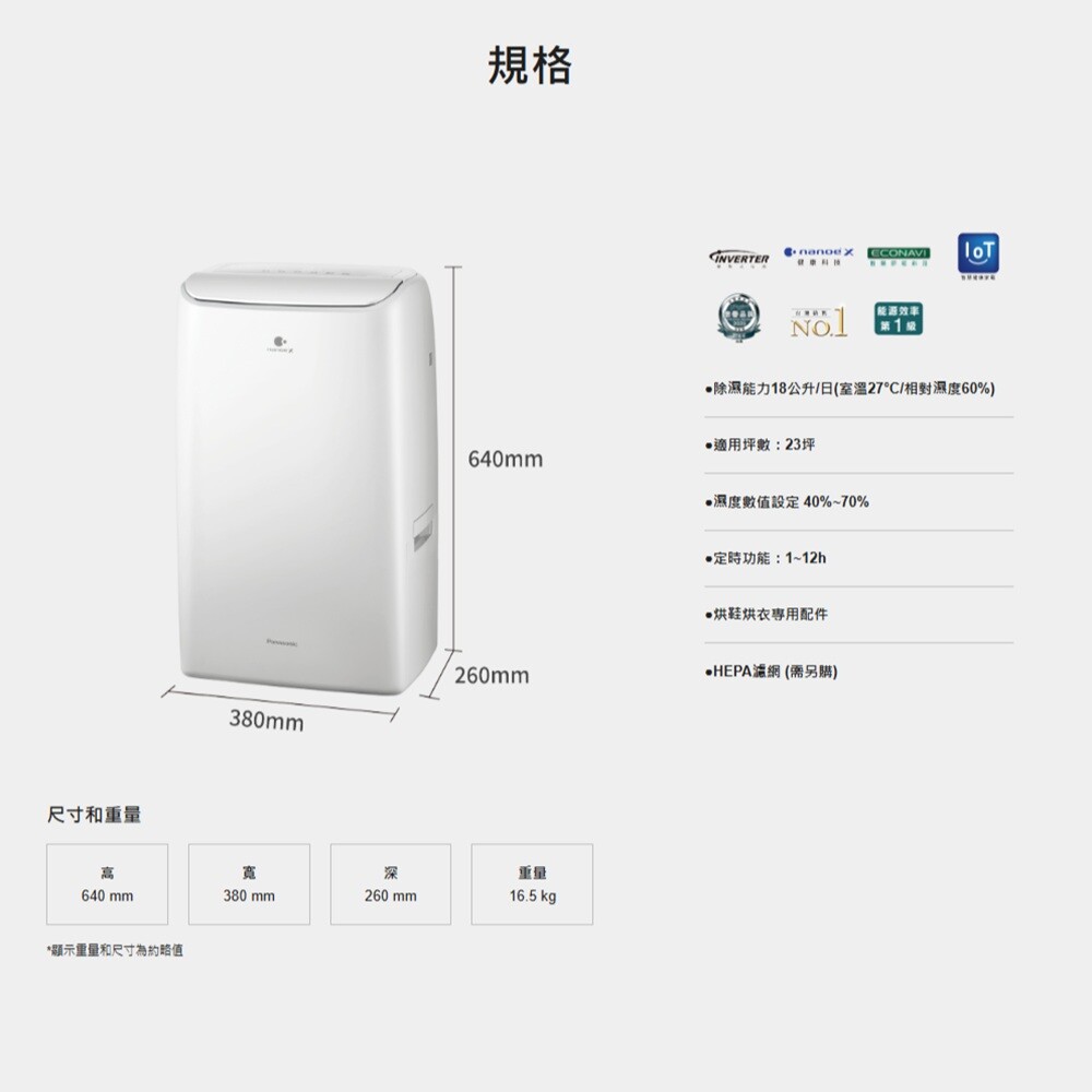 ◎ 除濕能力:18公升/日