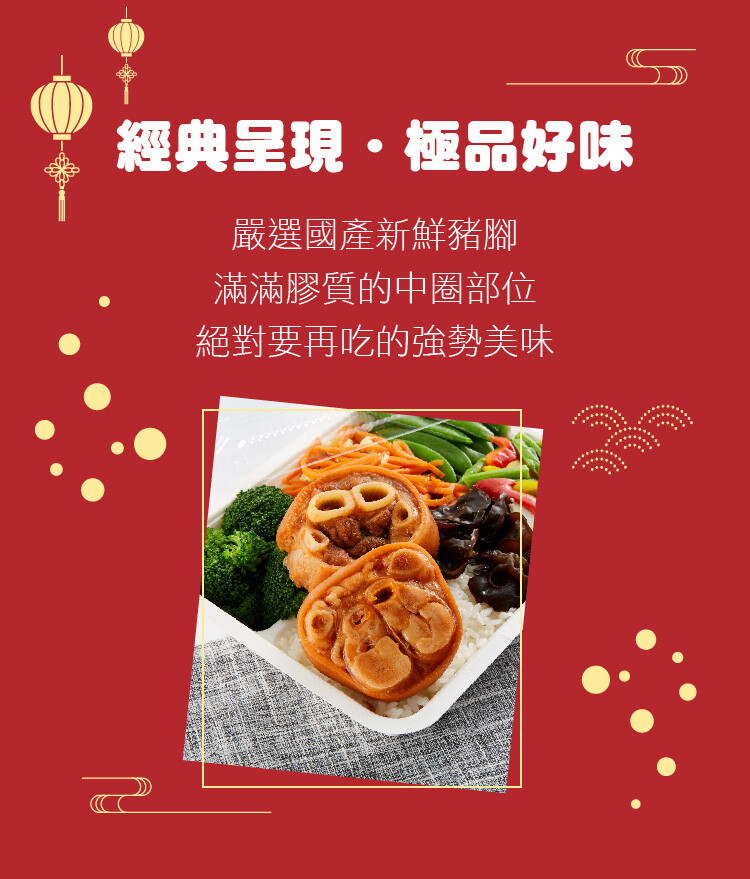 成分:豬腳(台灣)、醬油、鹽、紅糖、品質改良劑(多磷酸鈉、焦磷酸鈉)、調味劑(L-麩氨酸鈉、5' -鳥嘌呤核苷磷酸二鈉、5’-次黃嘌呤核苷磷酸二鈉、琥珀酸二鈉)、辛香料(白胡椒粉、蒜粉、油桂粉、百草、月桂草、甘草、八角、孜然)、肉精粉(酸水解醬油、葡萄糖漿、雞肉抽出物、DL-氨基丙酸、酵母抽出物、燻味香料粉(乳糖、香料、二氧化矽)、食用黃色5號、膨脹劑(碳酸氫鈉)。