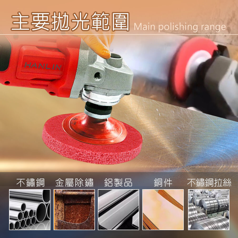 金屬加工:適用於不鏽鋼、合金、銅、鋁、鐵等工件拋光、去毛邊、拉絲,常用於鎖具、餐具、建築五金、電鍍件、汽車與飛機零件等,效果細緻耐磨。