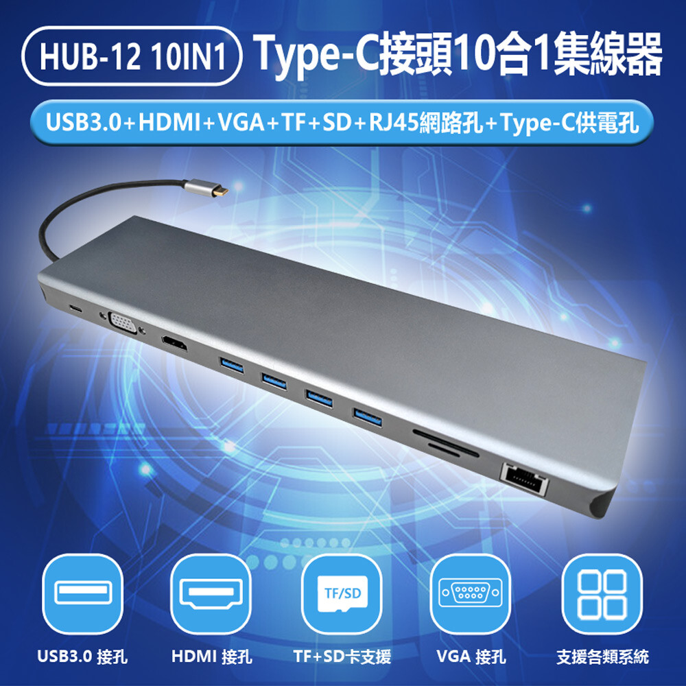 ★ USB3.0×4 + HDMI×1 + VGA×1 + TF×1 + SD×1 + RJ45網路孔×1 + Type-C供電孔×1 十合一接孔傳輸