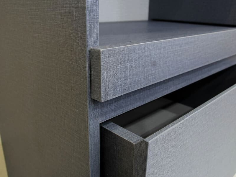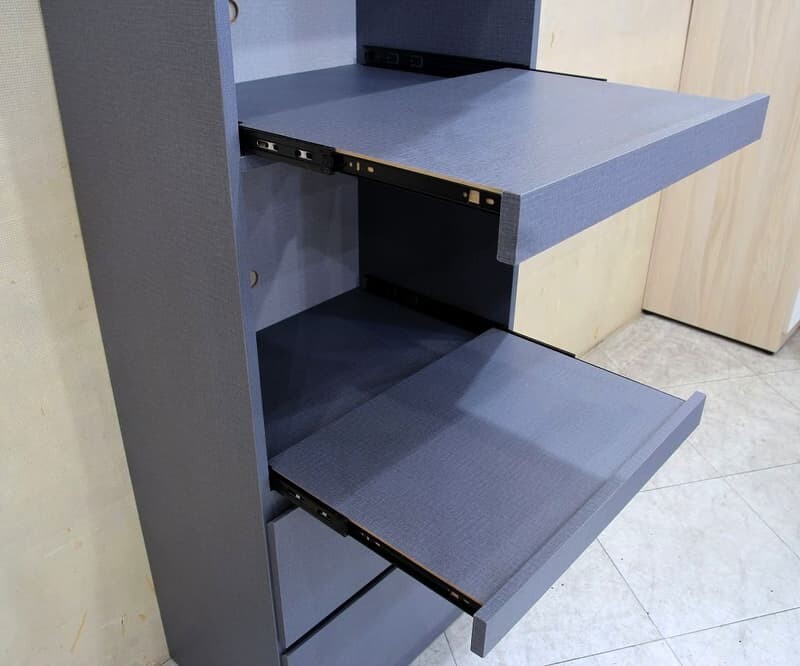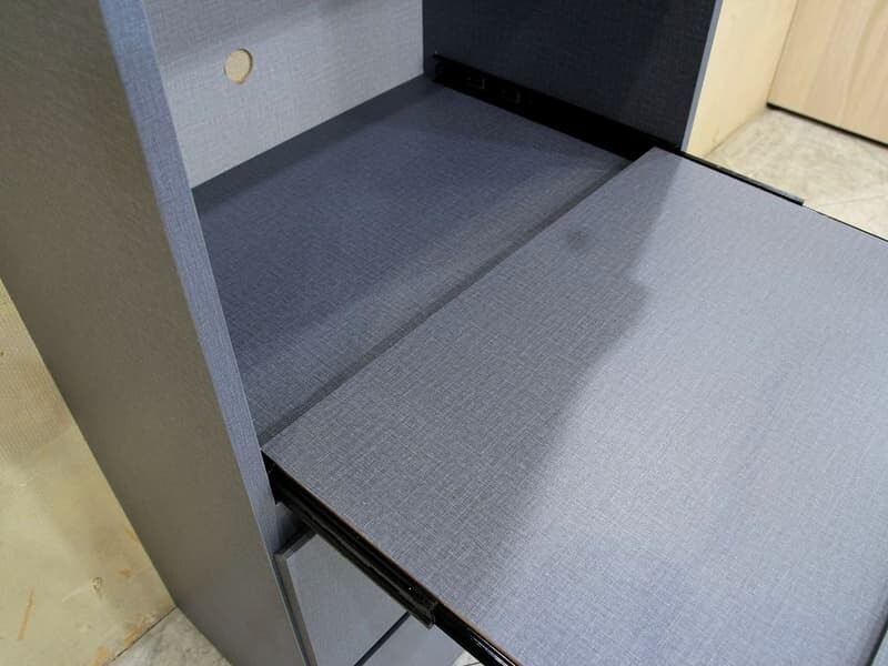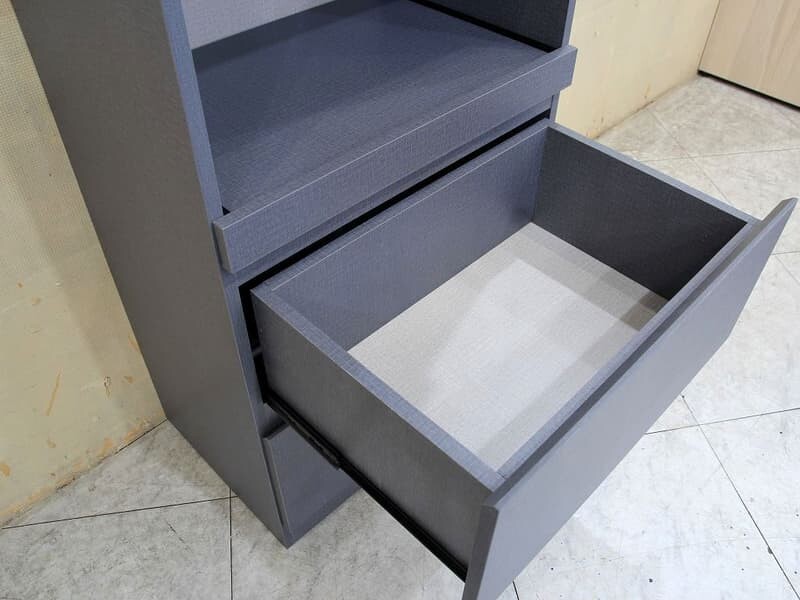 | 材質 | 板材 : 桶身,門片,抽牆及內部隔板皆為木心板材,門片緩衝後鈕,無把手設計 簡潔大方 塗裝 : 亞麻灰色耐磨皮面,ABS封邊質感細緻 五金 : 全組雙截式鋼珠滑軌,門片緩衝後鈕 |