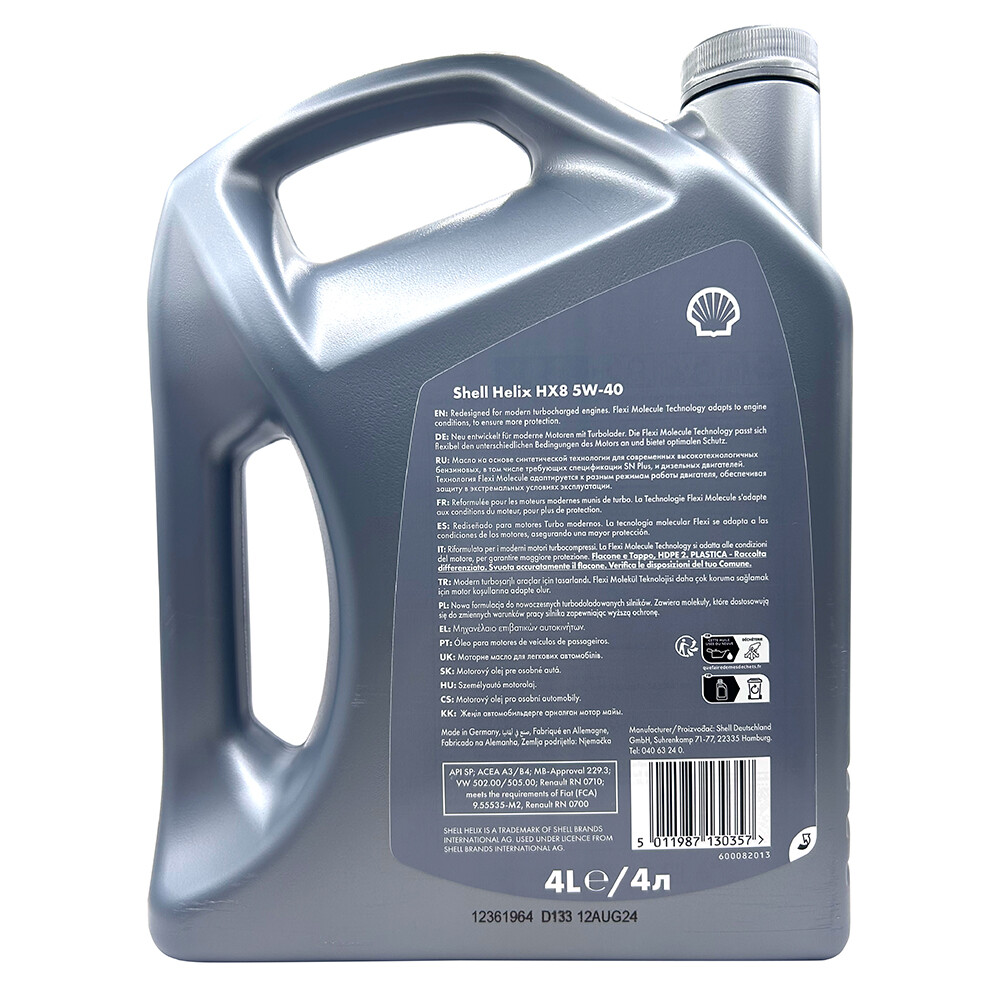 Shell Helix HX8 5W-40 為德國製高性能全合成機油,採用 Shell Flexi-Molecule 分子技術,能智能強化油膜,在高溫、高負載環境下提供更強保護力。