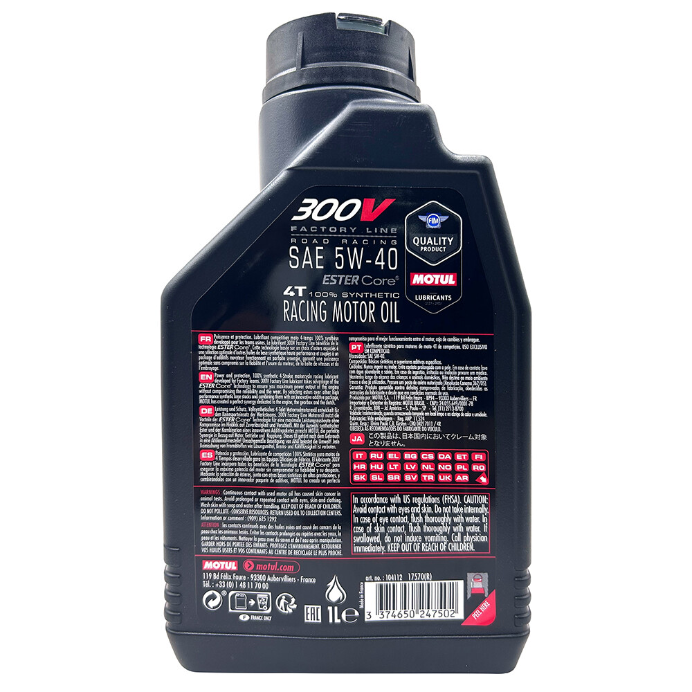 MOTUL 300V 4T 5W-40 為 MOTUL 最高階 Factory Line 賽車級酯類(ESTER Core®) 全合成 4 行程重機機油,專為公路競技與專業賽事所研發。