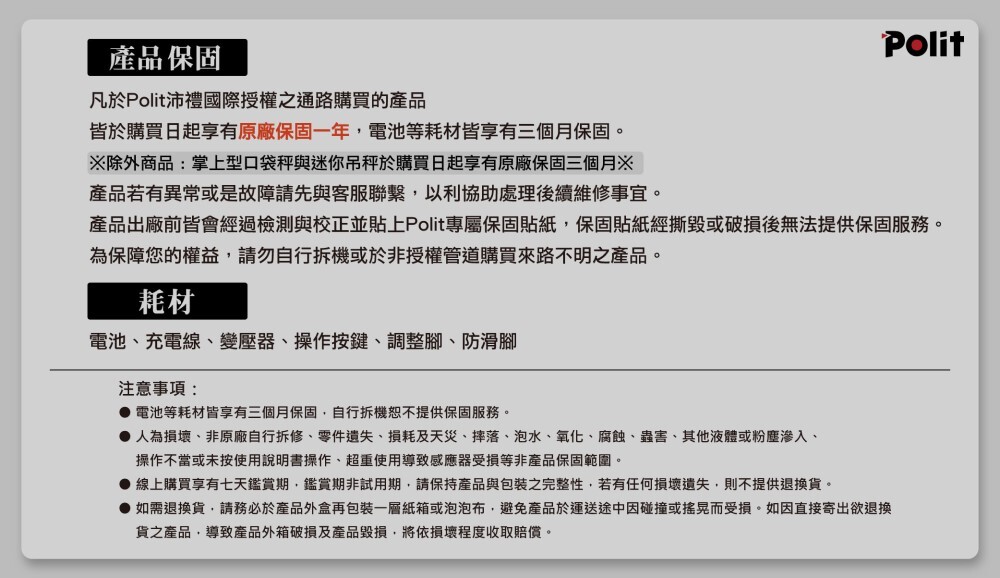 產品保固1年僅限於電子秤機體,電池、電線等損耗品則享有3個月保固。人為損壞、非原廠自行拆修、因人為導致零件遺失、所耗及天災、摔落、泡水、氧化、腐蝕、蟲害、其他液體或粉塵滲入、操作不當或未按使用說明書操作、超重使用導致感應器受損等非產品保固範圍。鑑賞期非試用期,本產品一經使用,則需負擔耗材及清潔費用,建議您訂購前請先確認評估。