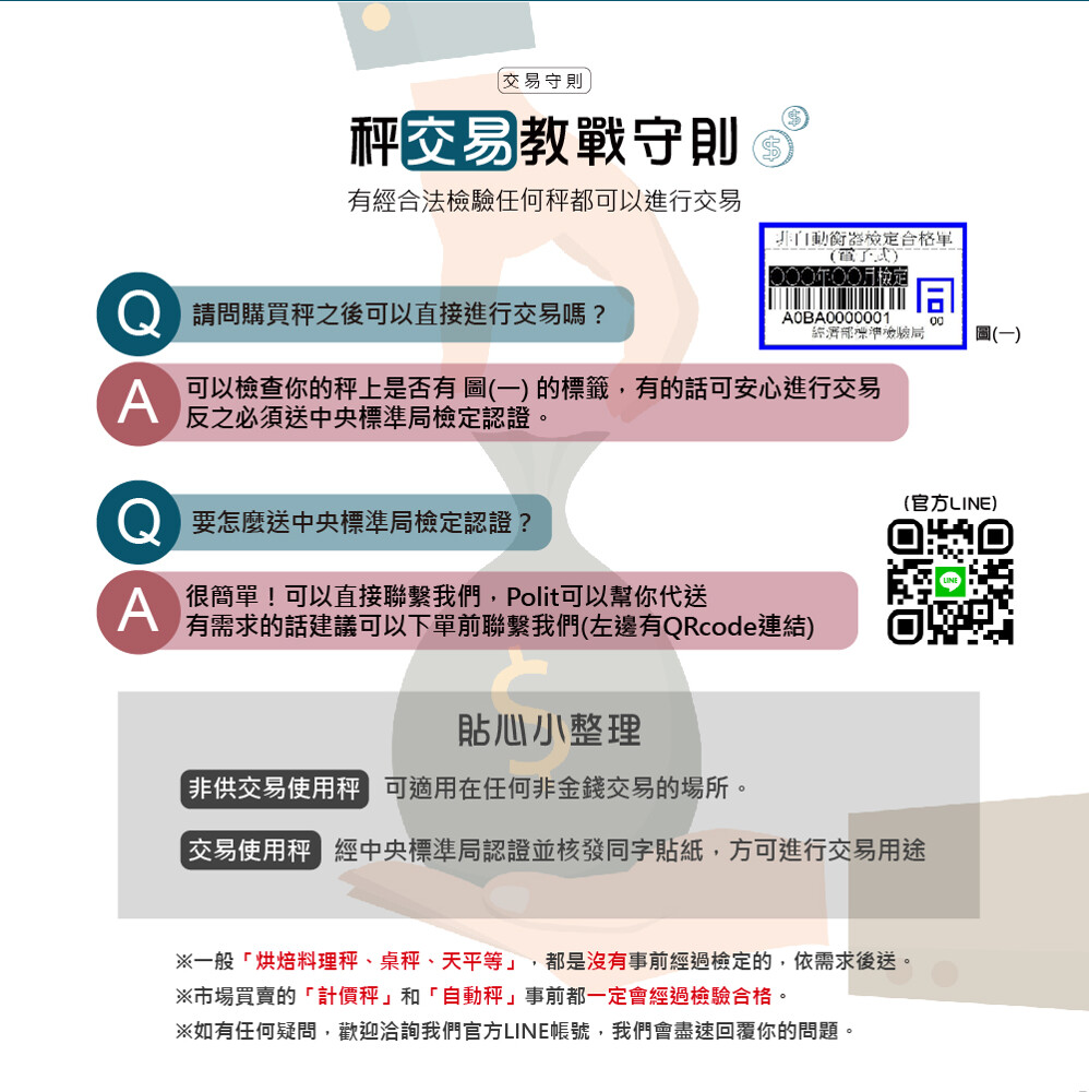 秤重規格(耐重 x 感量):30Kg(50台斤) x 5g(1錢/10g(2錢) (自動變換)