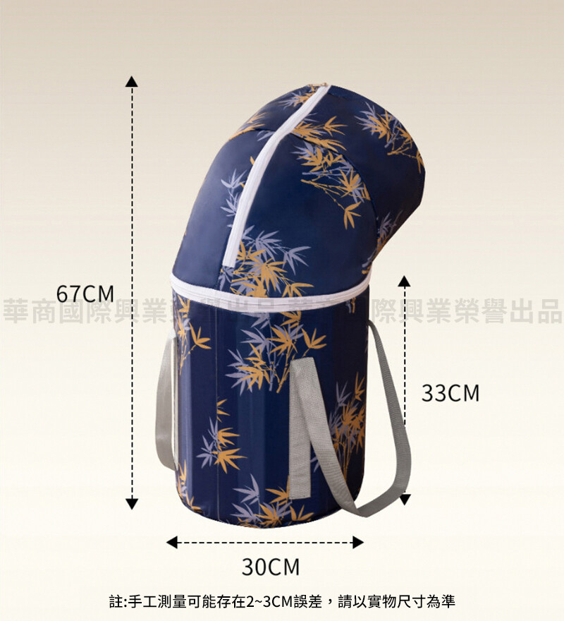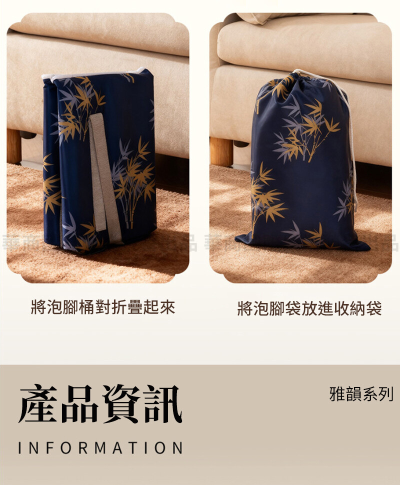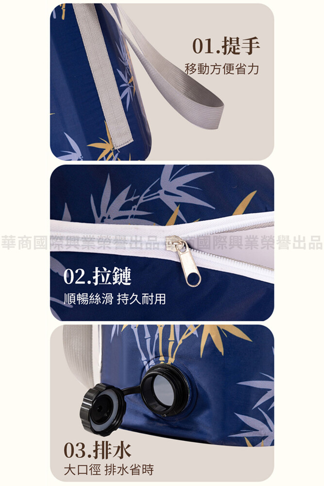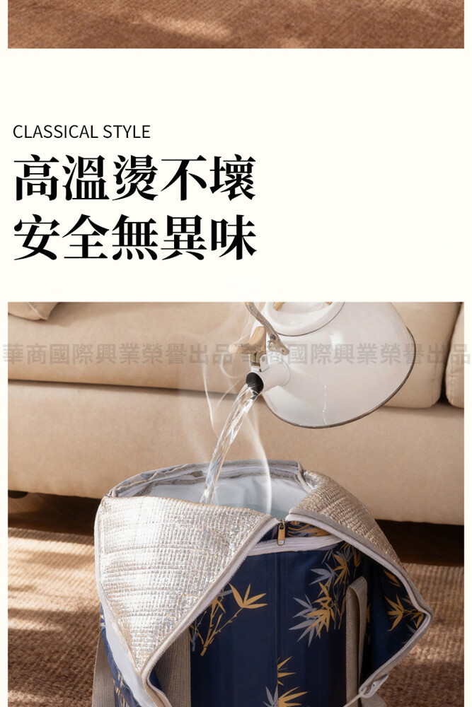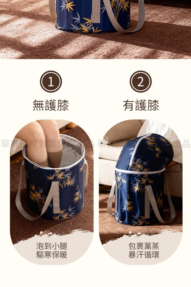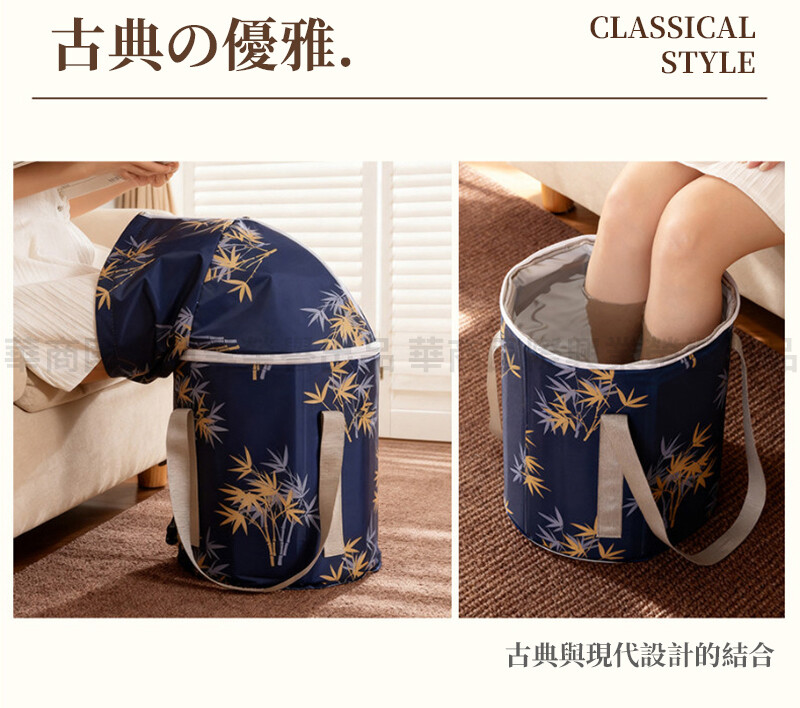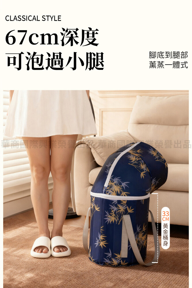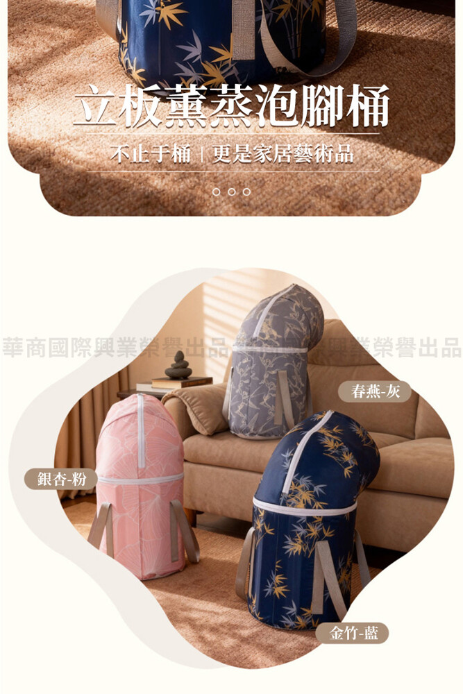 品名:古典風穩固立板薰蒸泡腳桶-過膝包覆款 材質:耐磨滌綸布、珍珠棉、PVC內膽 尺寸:67*30*33cm 顏色:春燕-灰色、銀杏-粉色、金竹-藍色 註:手工測量可能存在2~3CM誤差,請以實際尺寸為準
