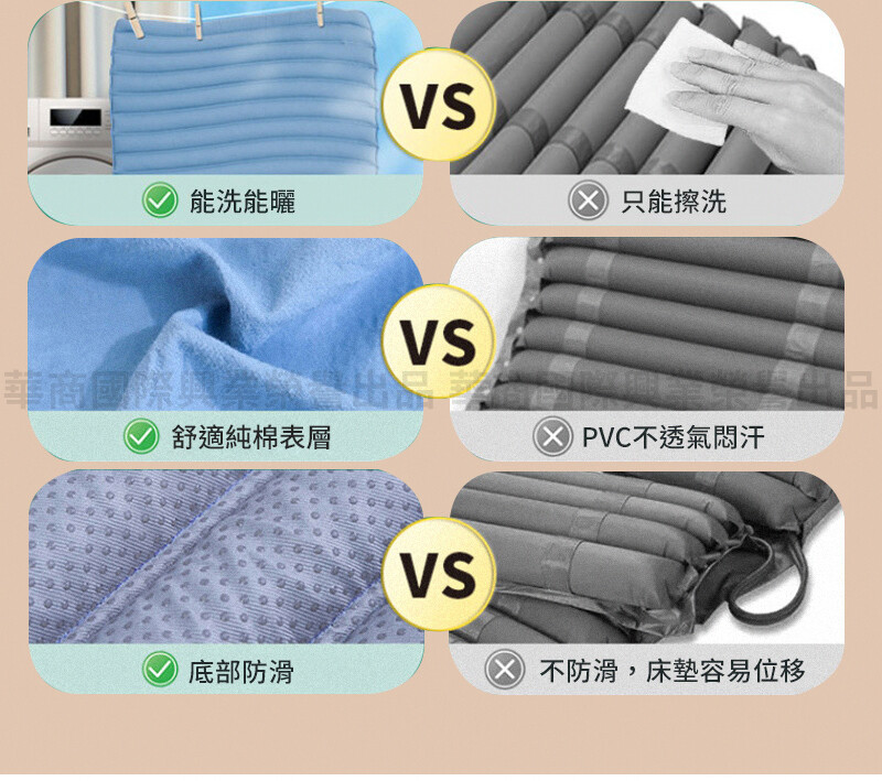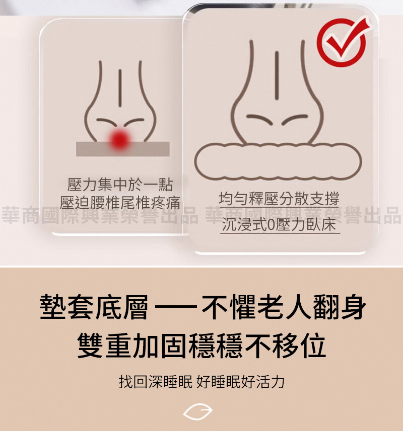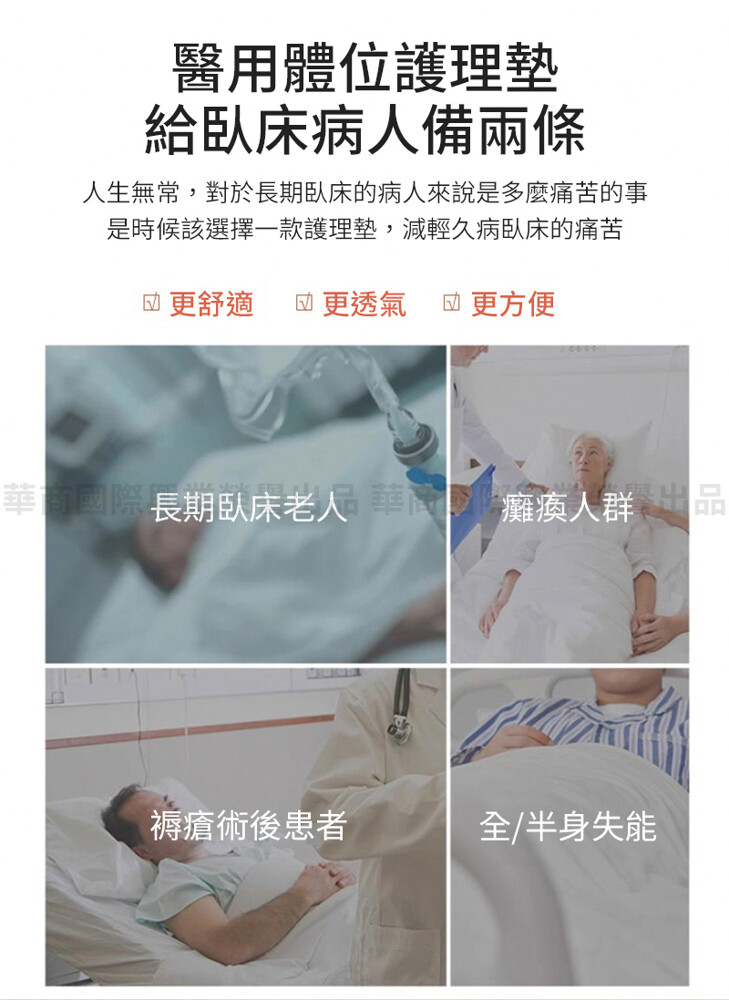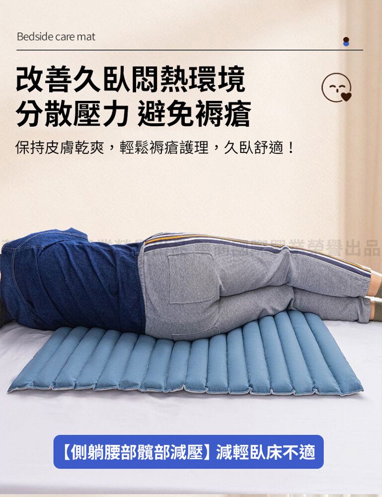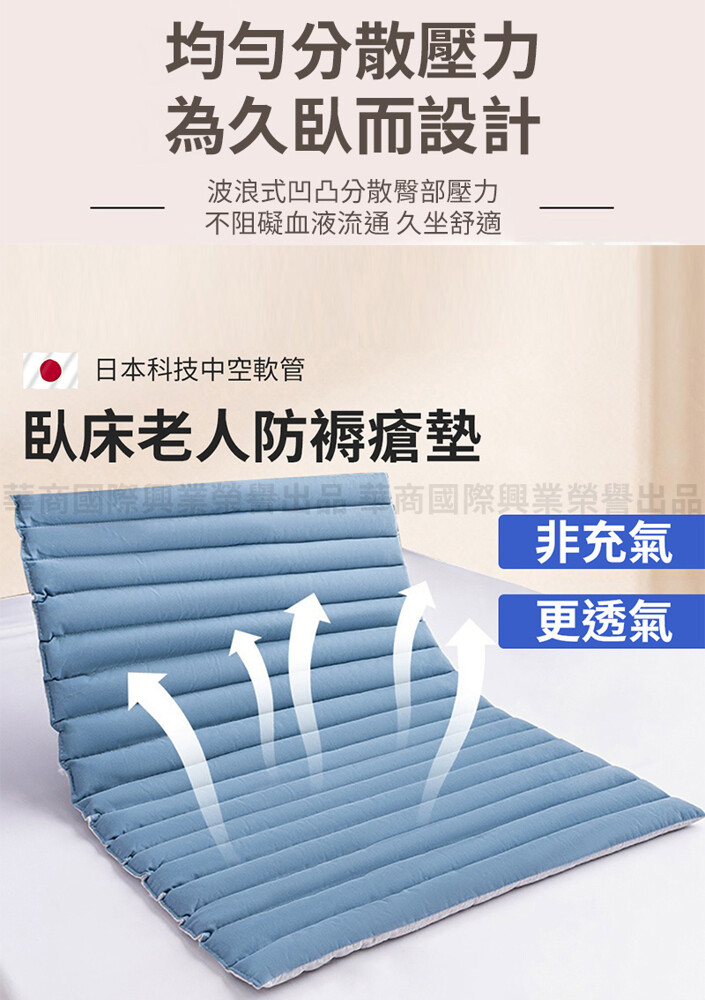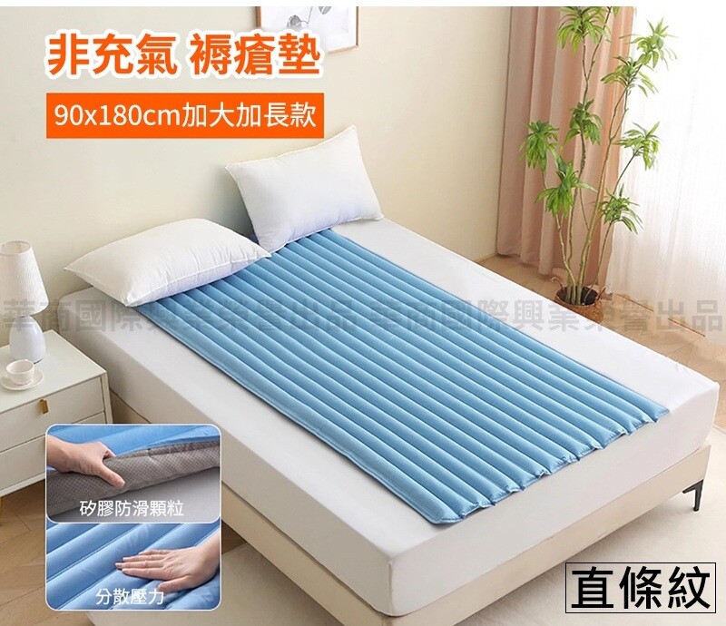 產品名稱:日本科技減壓透氣防褥瘡床墊 規格型號:90x180cm加大加長款(直條紋) 適用人群:適用於術後、褥瘡、痔瘡、全/半身失能、長期臥床患者 產品材質:表布:100%棉、中間層:TPE中空軟管、底部:防滑膠層