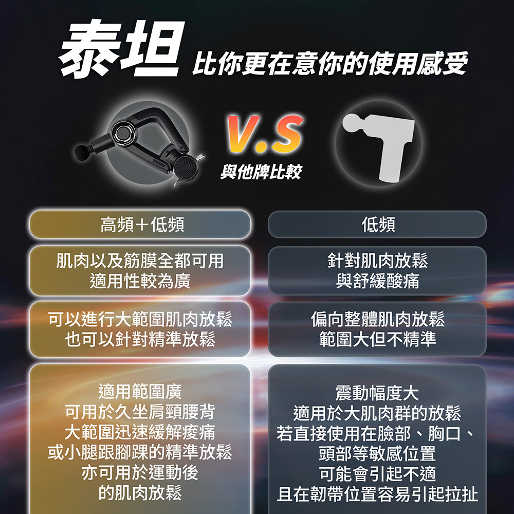 泰坦雙鋒搭載高頻+筋膜雙模式,能同時針對深層肌肉與筋膜放鬆,適用範圍廣又精準。他牌效果有限,雙鋒更勝一籌。