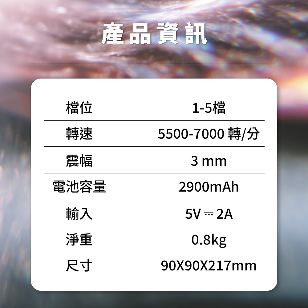 提供 1–5 檔變速,轉速 5500–7000 轉/分,震幅 3mm,搭載 2900mAh 電池,淨重 0.8kg,兼顧輕巧與穩定輸出。