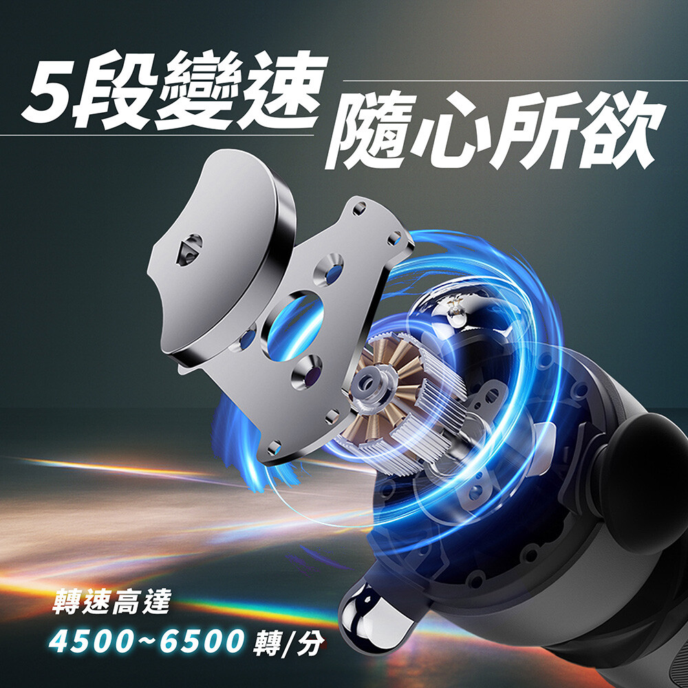 提供 5 段變速選擇,轉速高達 5000–6500 轉/分,從低檔的溫和震動到高檔的深層衝擊,能根據不同身體部位與需求自由切換。使用者可選擇低速進行表層放鬆,也能切換高速達到深層肌肉釋放。