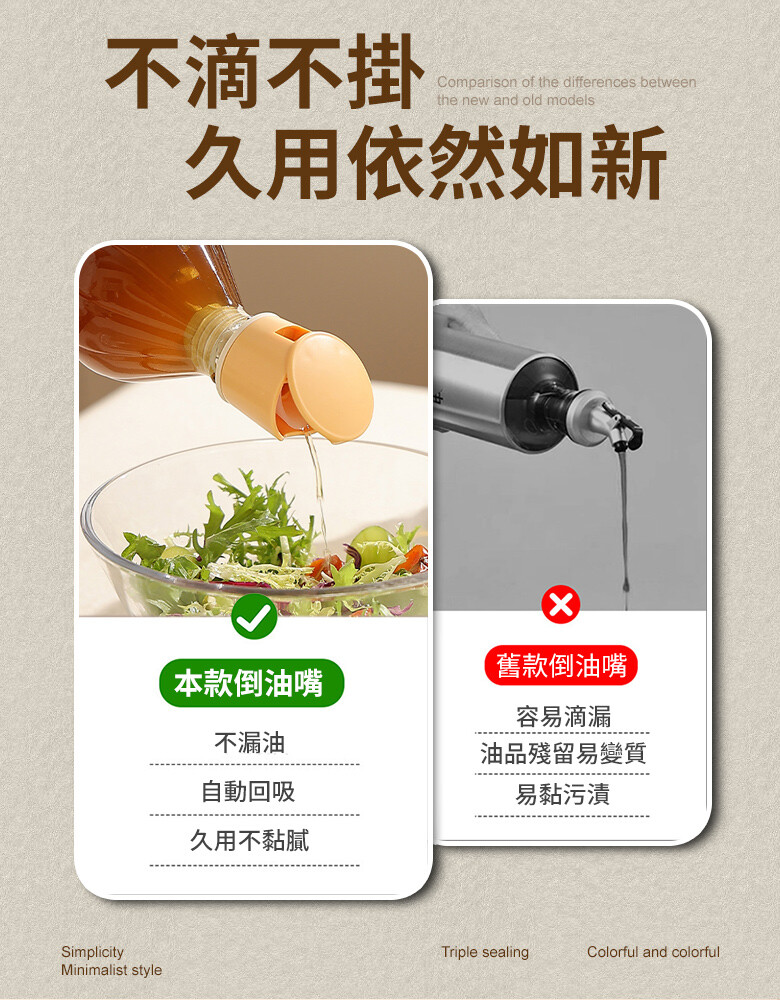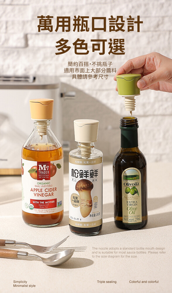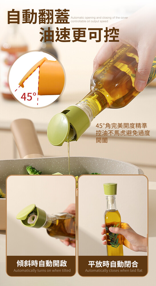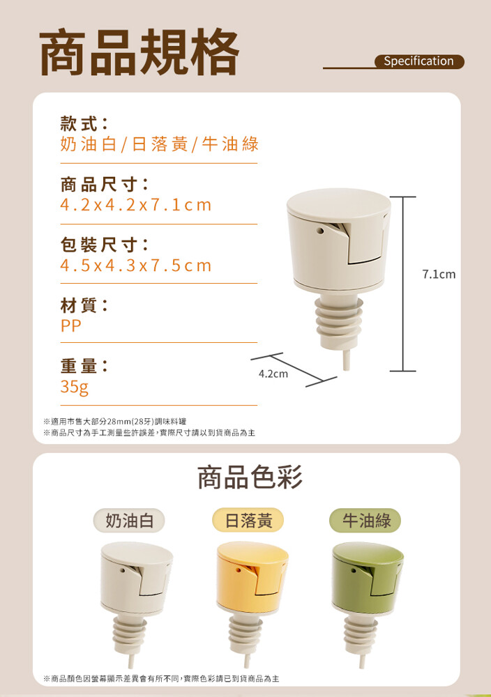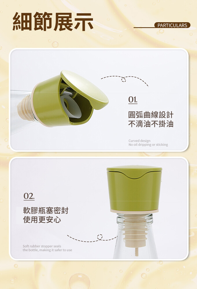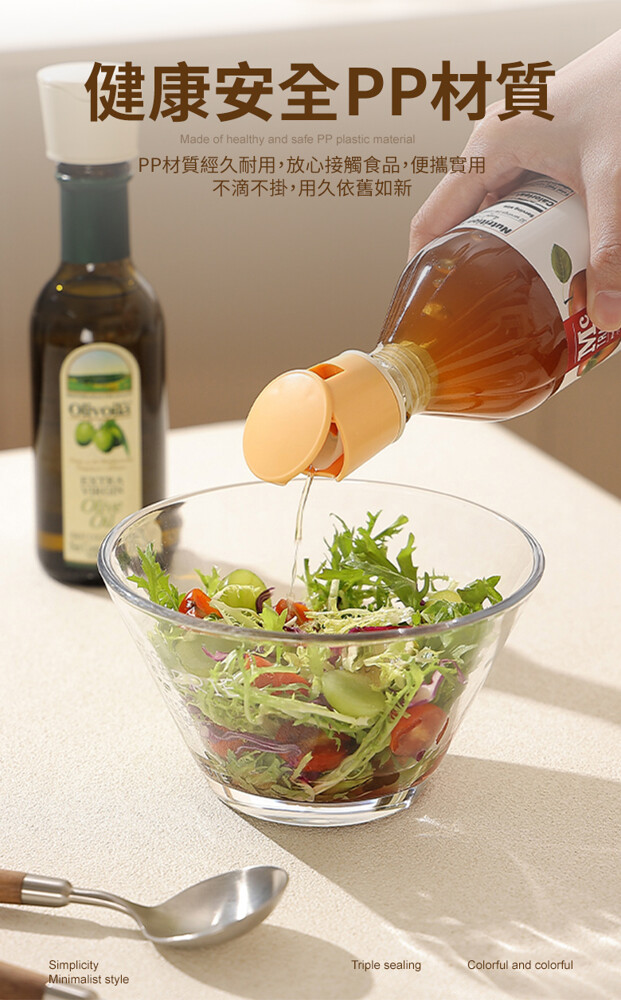 ★自動開合 單手輕鬆操作 ★內嵌式加強密封不滴漏 ★通用萬用瓶口 簡易安裝 ★黃金45°角 自動翻蓋好控量 款式:奶油白/日落黃/牛油綠(精準控量 不滴漏) 商品尺寸:4.2x4.2x7.1cm 材質:PP